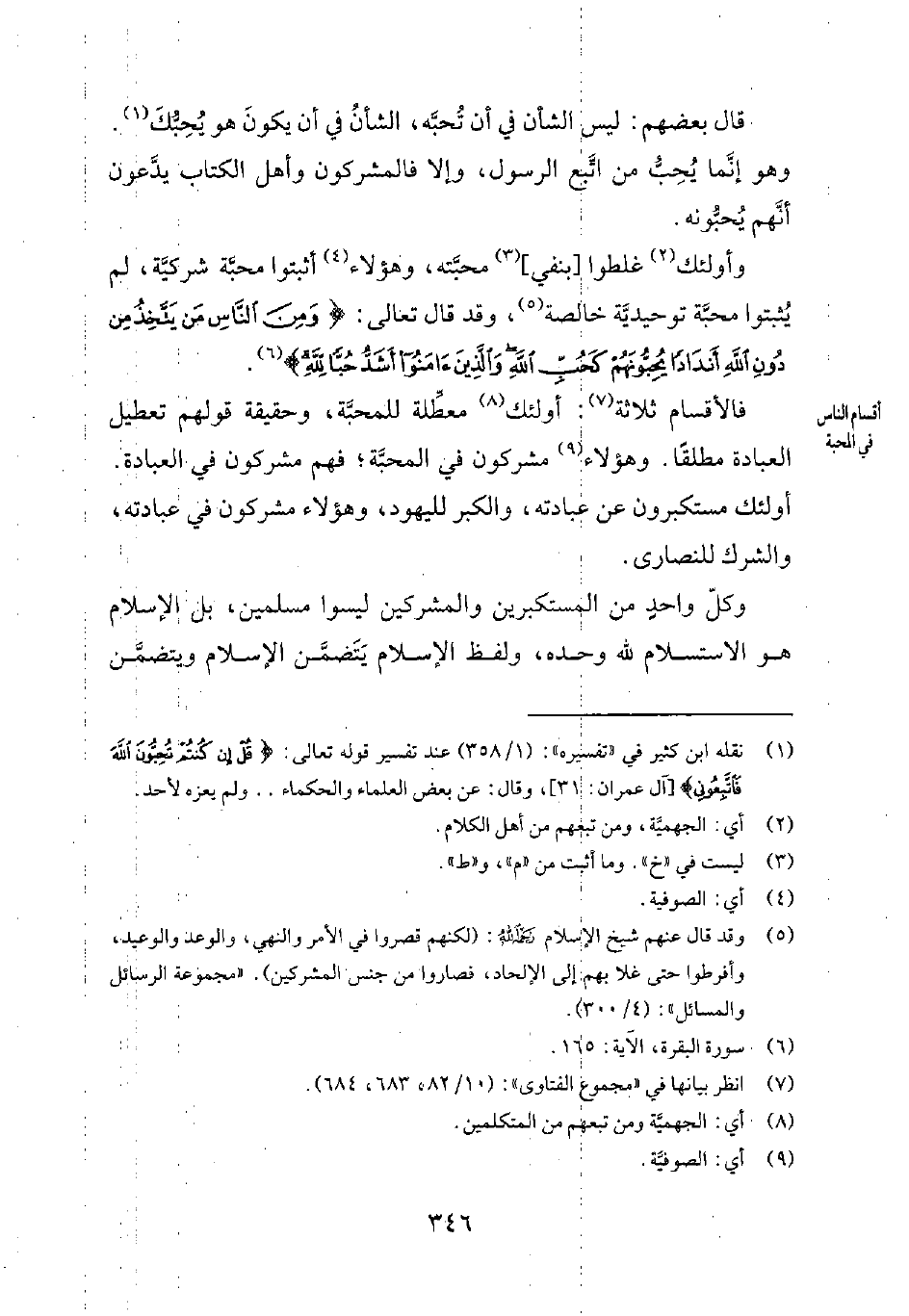 فالأقسام ثلاثة7: أولئك8 معطّلة للمحبّة، وحقيقة قولهم تعطيل العبادة مطلقاً. وهؤلاء9 مشركون في المحبّة؛ فهم مشركون في العبادة. أولئك مستكبرون عن عبادته، والكبر لليهود. وهؤلاء مشركون في عبادته، والشرك للنصارى.