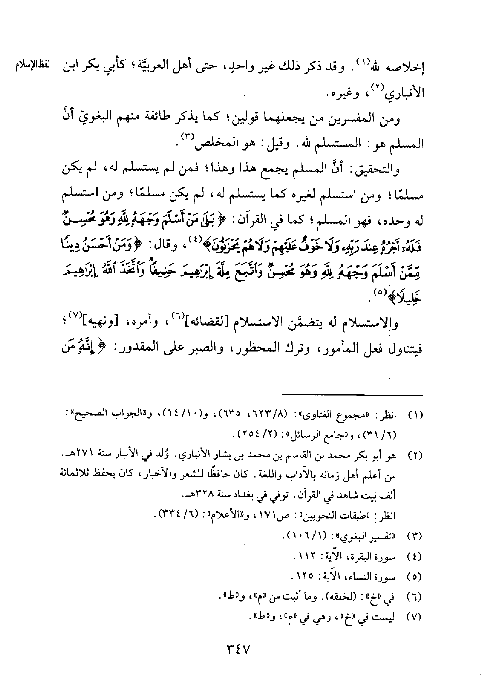 ومن المفسرين من يجعلهما قولين؛ كما يذكر طائفة منهم البغويّ أنّ المسلم هو: المستسلم لله. وقيل: هو المخلص3.