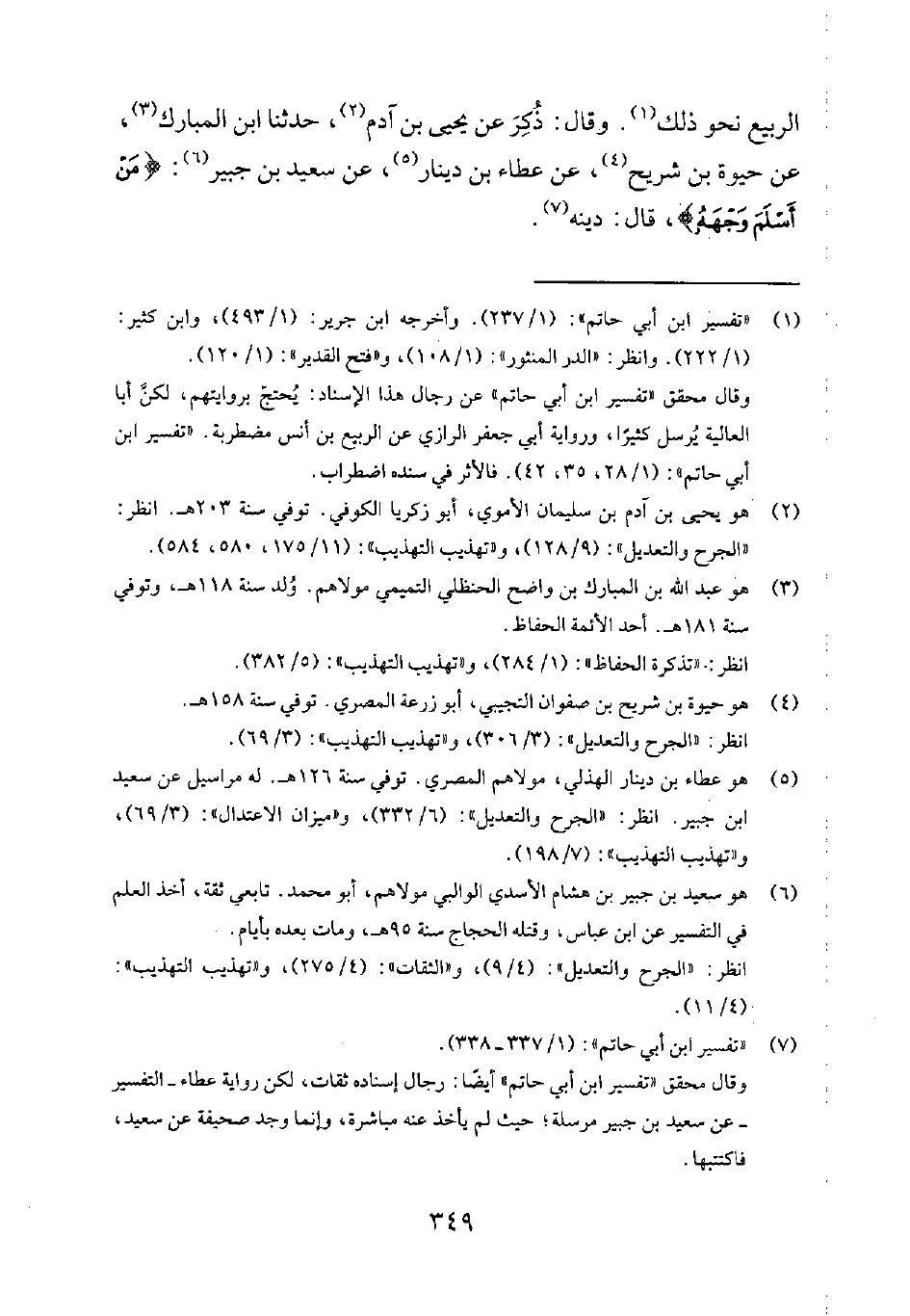 وقال محقق تفسير ابن أبي حاتم أيضاً: رجال إسناده ثقات، لكن رواية عطاء - التفسير - عن سعيد بن جبير مرسلة؛ حيث لم يأخذ عنه مباشرة، وإنما وجد صحيفة عن سعيد، فاكتتبها.