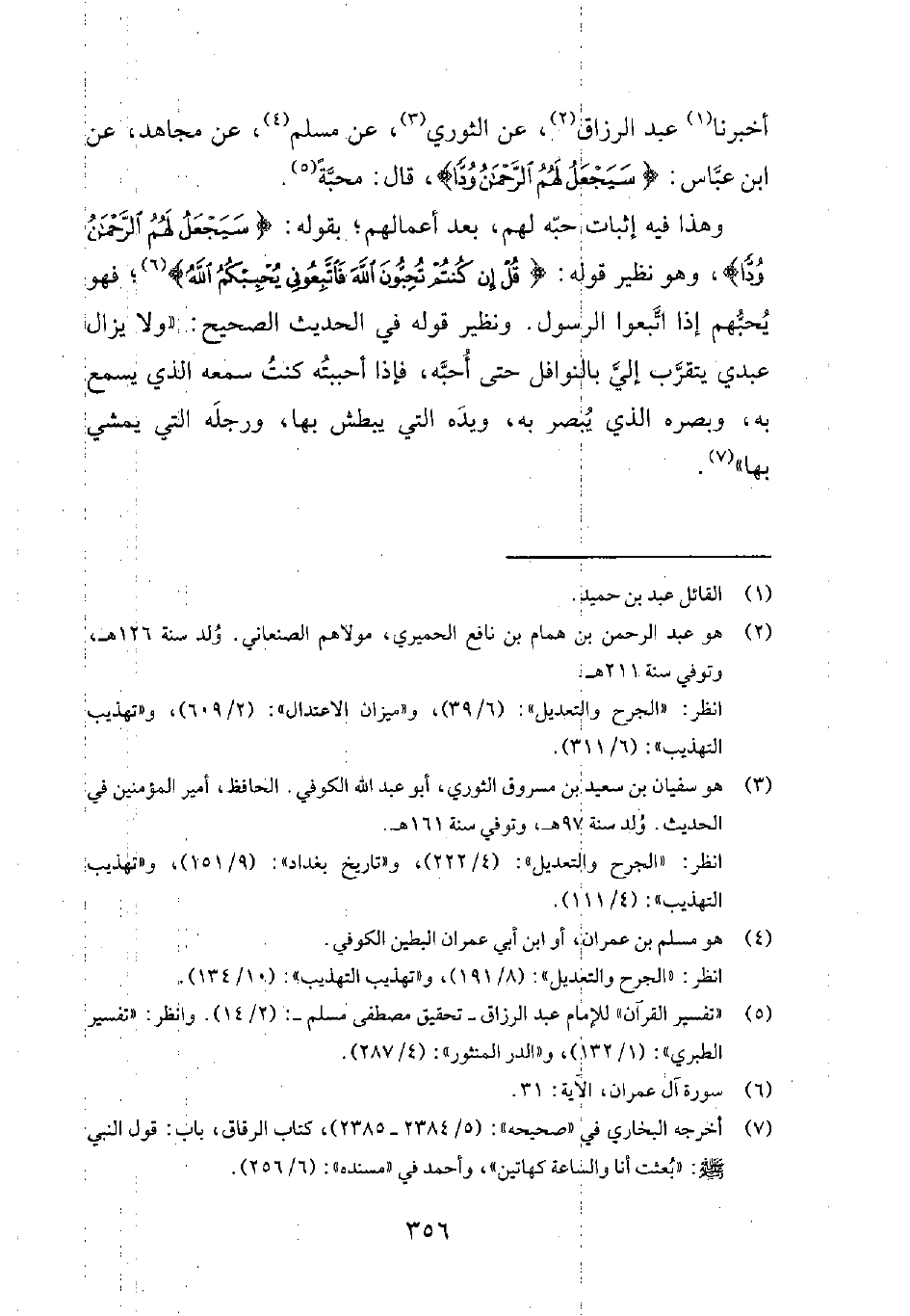 أخبرنا1 عبد الرزاق2، عن الثوري3، عن مسلم4، عن مجاهد، عن ابن عبّاس: {سَيَجْعَلُ لَهُمُ الرَّحْمَنُ وُدَّاً} ، قال: محبّةً5.