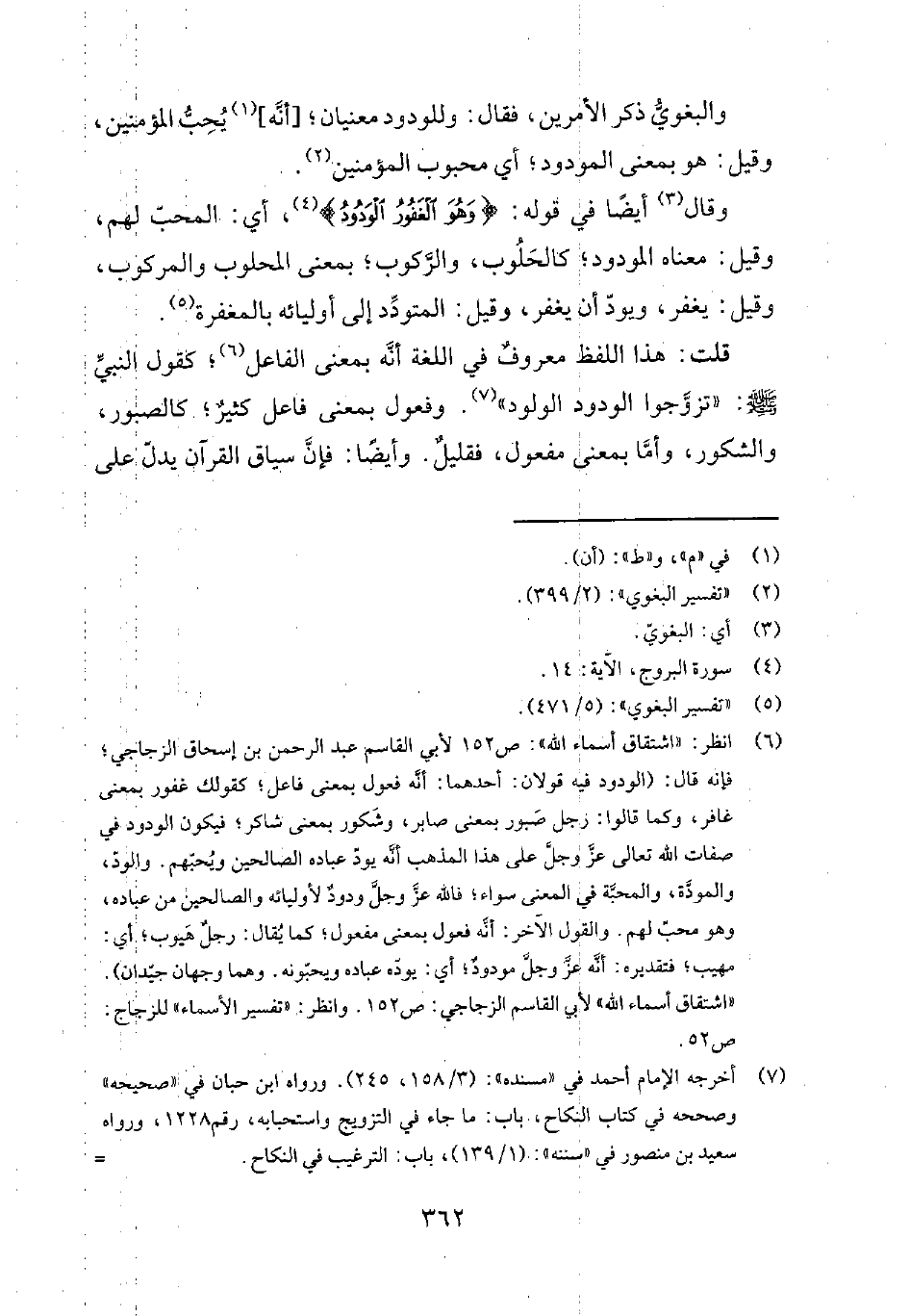 6 انظر: اشتقاق أسماء الله ص 152 لأبي القاسم عبد الرحمن بن إسحاق الزجاجي؛ فإنه قال: "الودود فيه قولان: أحدهما: أنّه فعول بمعنى فاعل؛ كقولك غفور بمعنى غافر، وكما قالوا: رجل صَبور بمعنى صابر، وشَكور بمعنى شاكر؛ فيكون الودود في صفات الله تعالى عزّ وجلّ على هذا المذهب أنّه يودّ عباده الصالحين ويُحبّهم. والودّ، والمودّة، والمحبّة في المعنى سواء؛ فالله عزّ وجلّ ودودٌ لأوليائه والصالحين من عباده، وهو محبّ لهم. والقول الآخر: أنّه فعول بمعنى مفعول؛ كما يُقال: رجلٌ هَيوب؛ أي مهيب؛ فتقديره: أنّه عزّ وجلّ مودودٌ؛ أي يودّه عباده ويحبّونه. وهما وجهان جيّدان". اشتقاق أسماء الله لأبي القاسم الزجاجي ص 152. وانظر: تفسير الأسماء للزجاج ص 52.