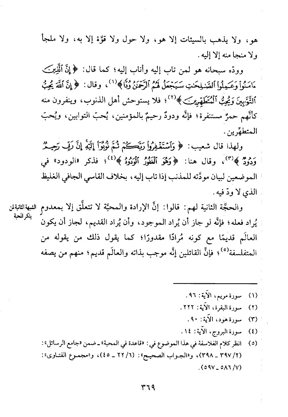5 انظر: كلام الفلاسفة في هذا الموضوع في: قاعدة في المحبة - ضمن جامع الرسائل 2397-398 -. والجواب الصحيح 622-45. ومجموع الفتاوى 7586-597.
