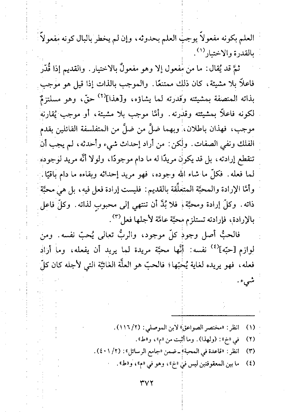 ثمّ قد يُقال: ما من مفعول إلا وهو مفعولٌ بالاختيار. والقديم إذا قُدّر فاعلاً بلا مشيئة، كان ذلك ممتنعاً. والموجب بالذات إذا قيل هو موجب بذاته المتصفة بمشيئته وقدرته لما يشاؤه، و [هذا] 2 حقّ، وهو مستلزمٌ لكونه فاعلاً بمشيئته وقدرته. وأمّا موجب بلا مشيئة، أو موجب يُقارنه موجب، فهذان باطلان، وبهما ضلّ من ضلّ من االمتفلسفة القائلين بقدم الفلك ونفي الصفات. ولكن: من أراد إحداث شيء وأحدثه، لم يجب أن تنقطع إرادته، بل قد يكون مريداً له ما دام موجوداً، ولولا أنّه مريد لوجوده لما فعله. فكلّ ما شاء الله وجوده، فهو مريد إحداثه وبقاءه ما دام باقياً. وأمّا الإرادة والمحبّة المتعلّقة بالقديم: فليست إرادة فعل فيه، بل هي محبّة ذاته. وكلّ إرادة ومحبّة، فلا بُدّ أن تنتهي إلى محبوبٍ لذاته. وكلّ فاعل بالإرادة، فإرادته تستلزم محبّة عامّة لأجلها فعل3.