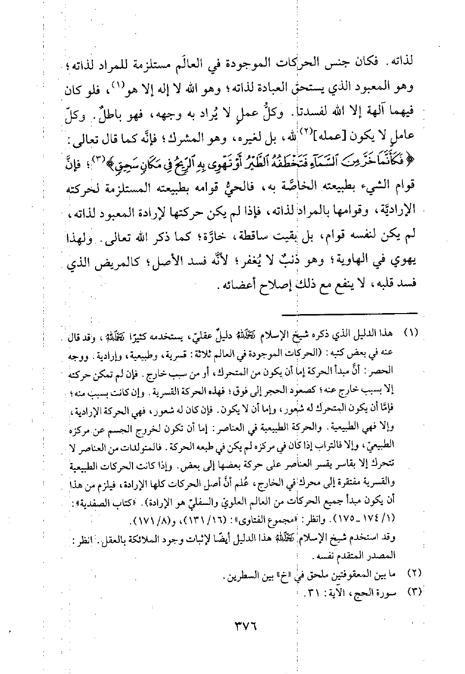 لذاته. فكان جنس الحركات الموجودة في العالَم مستلزمة للمراد لذاته؛ وهو المعبود الذي يستحق العبادة لذاته؛ وهو الله لا إله إلا هو1، فلو كان فيهما آلهة إلا الله لفسدتا. وكلّ عملٍ لا يُراد به وجهه، فهو باطلٌ. وكلّ عاملٍ لا يكون [عمله] 2 لله، بل لغيره، وهو المشرك؛ فإنّه كما قال تعالى: {فَكَأَنَّمَاْ خَرَّ مِنَ السَّمَاْءِ فَتَخْطَفُهُ الطَّيْرُ أَوْ تَهْوِيْ بِهِ الرِّيْحُ فِيْ مَكَاْنٍ سَحِيْقٍ} 3؛ فإنّ قوام الشيء بطبيعته الخاصّة به؛ فالحيّ قوامه بطبيعته المستلزمة لحركته الإراديّة، وقوامها بالمراد لذاته، فإذا لم يكن حركتها لإرادة المعبود لذاته، لم يكن لنفسه قوام، بل بقيت ساقطة، خارَّة؛ كما ذكر الله تعالى. ولهذا يهوي في الهاوية؛ وهو ذنبٌ لا يُغفر؛ لأنّه فسد الأصل؛ كالمريض الذي فسد قلبه، لا ينفع مع ذلك إصلاح أعضائه.
