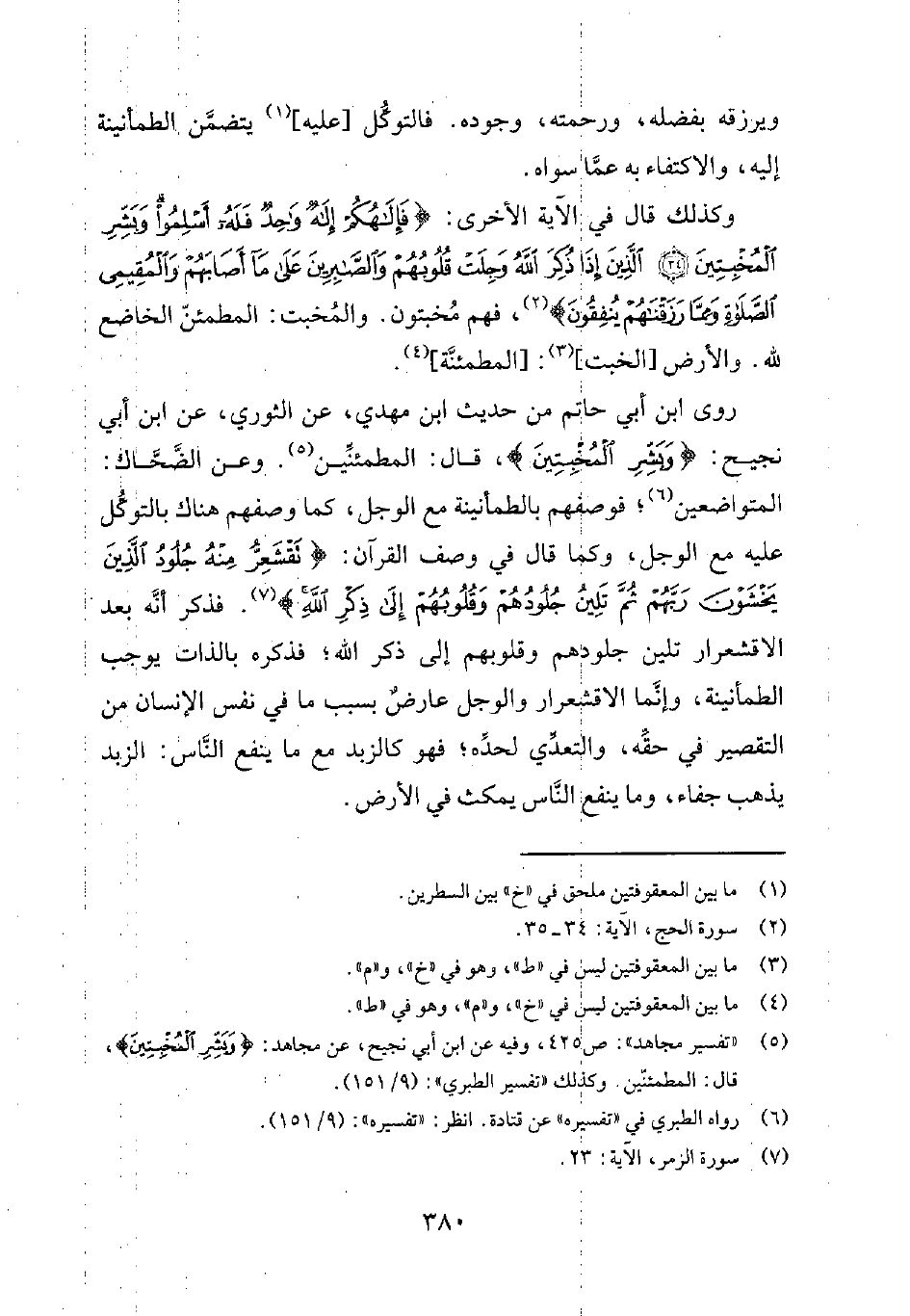 روى ابن أبي حاتم من حديث ابن مهدي، عن الثوري، عن ابن أبي نجيح: {وَبَشِّرِ الْمُخْبِتِيْنَ} ، قال: المطمئنّين5. وعن الضحّاك: المتواضعين6؛ فوصفهم بالطمأنينة مع الوجل، كما وصفهم هناك بالتوكّل عليه مع الوجل، وكما قال في وصف القرآن: {تَقْشَعِرُّ مِنْهُ جُلُوْدُ الَّذِيْنَ يَخْشَوْنَ رَبَّهُمْ ثُمَّ تَلِيْنُ جُلُوْدُهُمْ وَقُلُوْبُهُمْ إِلَىْ ذِكْرِ اللهِ} 7. فذكر أنّه بعد الاقشعرار تلين جلودهم وقلوبهم إلى ذكر الله؛ فذكره بالذات يوجب الطمأنينة، وإنّما الاقشعرار والوجل عارضٌ بسبب ما في نفس الإنسان من التقصير في حقّه، والتعدّي لحدّه؛ فهو كالزبد مع ما ينفع النّاس: الزبد يذهب جفاء، وما ينفع النّاس يمكث في الأرض.