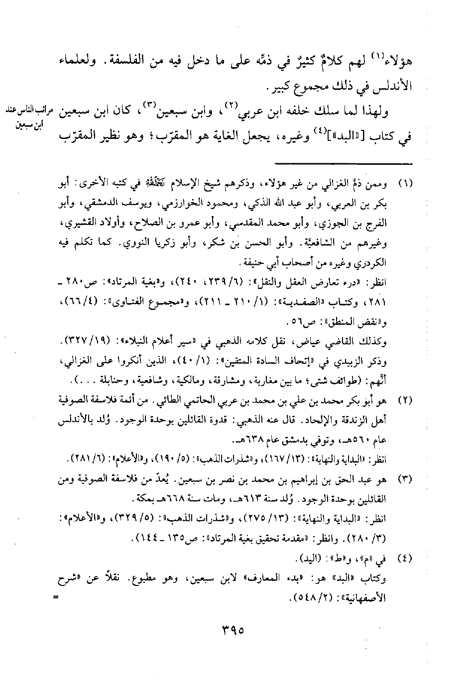 3 هو عبد الحق بن إبراهيم بن محمد بن نصر بن سبعين. يُعدّ من فلاسفة الصوفية ومن القائلين بوحدة الوجود. ولد سنة 613، ومات سنة 668 بمكة. انظر: البداية والنهاية 13275. وشذرات الذهب 5329. والأعلام 3280. وانظر: مقدمة تحقيق بغية المرتاد ص 135-144.