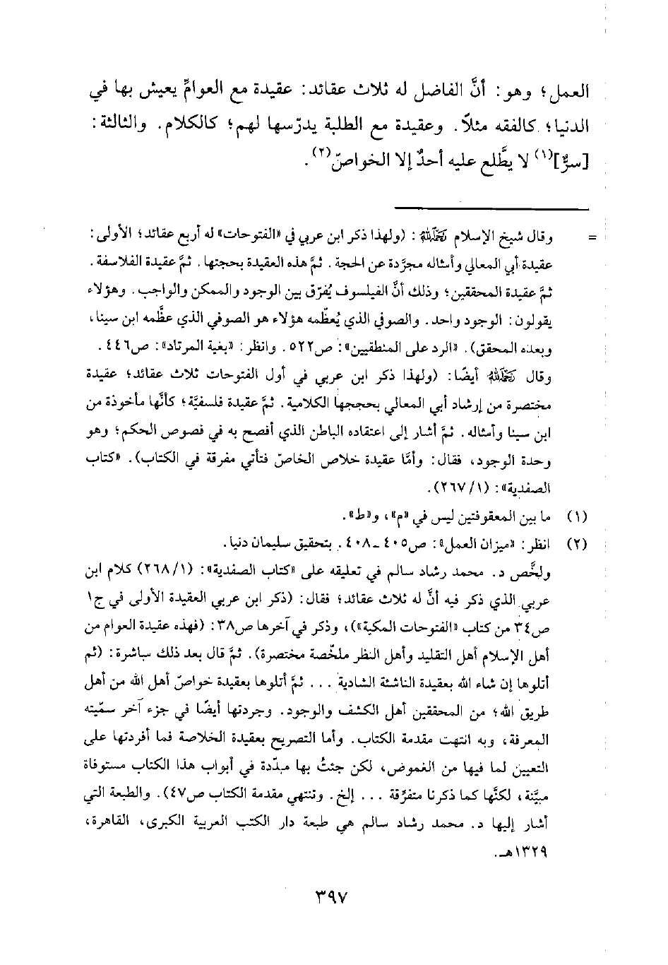 ولخّص د محمد رشاد سالم في تعليقه على كتاب الصفدية 1268 كلام ابن عربي الذي ذكر فيه أنّ له ثلاث عقائد؛ فقال: "كر ابن عربي العقيدة الأولى في ج 1 ص 34 من كتاب الفتوحات المكية، وذكر في آخرها ص 38: "هذه عقيدة العوام من أهل الإسلام أهل التقليد وأهل النظر ملخّصة مختصرة" ثمّ قال بعد ذلك مباشرة: "م أتلوها إن شاء الله بعقيدة الناشئة الشادية ... ثمّ أتلوها بعقيدة خواصّ أهل الله من أهل طريق الله؛ من المحققين أهل الكشف والوجود. وجردتها أيضاً في جزء آخر سمّيته المعرفة، وبه انتهت مقدمة الكتاب. وأما التصريح بعقيدة الخلاصة فما أفردتها على التعيين لما فيها من الغموض، لكن جئتُ بها مبدّدة في أبواب هذا الكتاب مستوفاة مبيّنة، لكنّها كما ذكرنا متفرّقة ... إلخ. وتنتهي مقدمة الكتاب ص 47" والطبعة التي أشار إليها دمحمد رشاد سالم هي طبعة دار الكتب العربية الكبرى، القاهرة، 1329 ?.