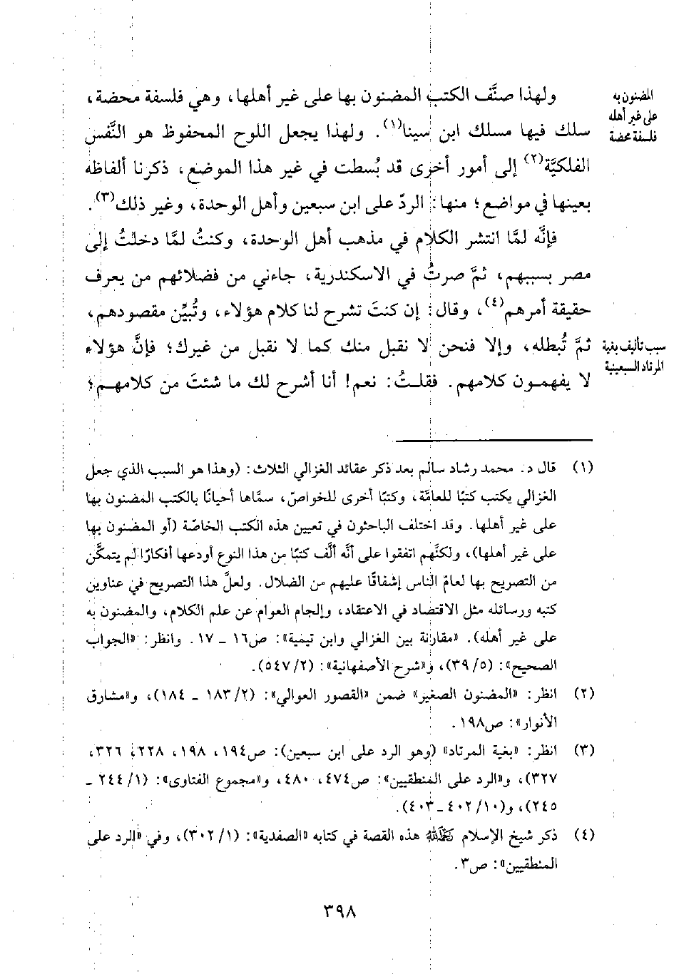 3 انظر: بغية المرتاد (وهو الرد على ابن سبعين) ص 194، 198، 228، 326، 327. والرد على المنطقيين ص 474، 480. ومجموع الفتاوى 1244-245، 10402-403.