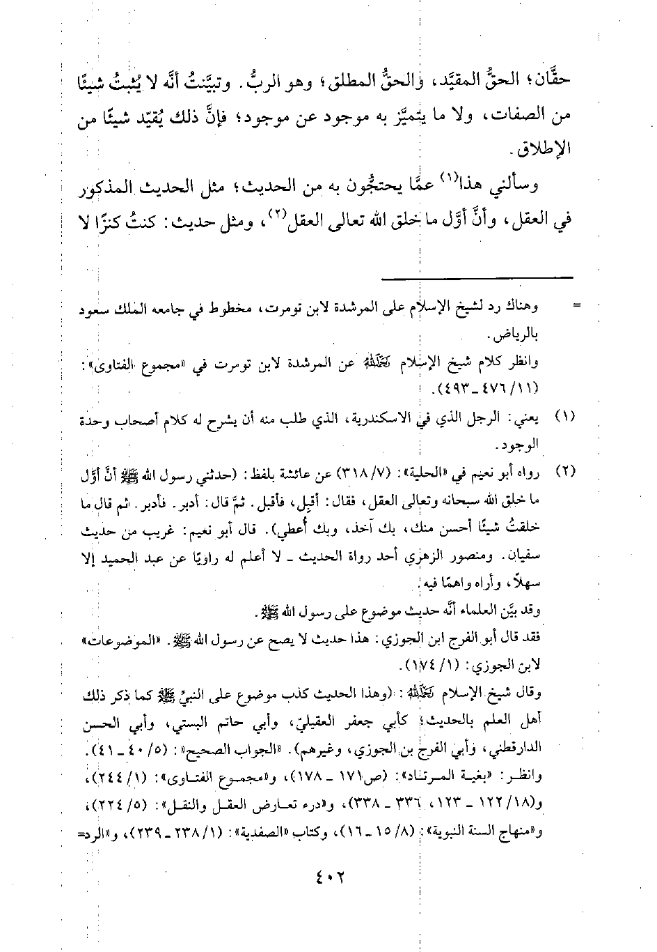 وقال شيخ الإسلام رحمه الله: "وهذا الحديث كذب موضوع على النبيّ صلى الله عليه وسلم كما ذكر ذلك أهل العلم بالحديث؛ كأبي جعفر العقيليّ، وأبي حاتم البستي، وأبي الحسن الدارقطني، وأبي الفرج بن الجوزي، وغيرهم". الجواب الصحيح 540-41. وانظر: بغية المرتاد ص 171-178. ومجموع الفتاوى 1244، 18122-123، 336-338. ودرء تعارض العقل والنقل 5224. ومنهاج السنة النبوية 815-16. وكتاب الصفدية 1238-239. والرد على المنطقيين ص 196-197. والفرقان بين أولياء الله وأولياء الشيطان ص 206.