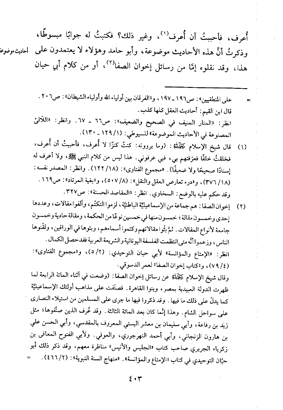 أُعرف، فأحببتُ أن أُعرف1، وغير ذلك؟ فكتبتُ له جواباً مبسوطاً، وذكرتُ أنّ هذه الأحاديث موضوعة، وأبو حامد وهؤلاء لا يعتمدون على هذا، وقد نقلوه إمّا من رسائل إخوان الصفا2، أو من كلام أبي حيان