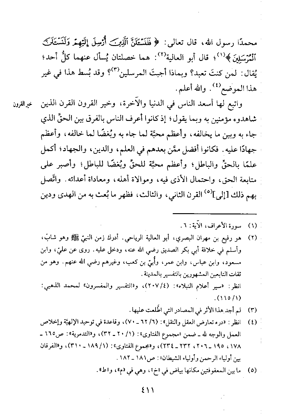 واتبع لها أسعد الناس في الدنيا والآخرة، وخير القرون القرن الذين شاهدوه مؤمنين به وبما يقول؛ إذ كانوا أعرف الناس بالفرق بين الحقّ الذي جاء به وبين ما يُخالفه، وأعظم محبّة لما جاء به وبُغضاً لما خالفه، وأعظم جهاداً عليه. فكانوا أفضل ممّن بعدهم في العلم، والدين، والجهاد؛ أكمل علماً بالحقّ والباطل؛ وأعظم محبّة للحقّ وبُغضاً للباطل؛ وأصبر على متابعة الحقّ، واحتمال الأذى فيه، وموالاة أهله، ومعاداة أعدائه. واتّصل بهم ذلك [إلى] 5 القرن الثاني، والثالث، فظهر ما بُعث به من الهدى ودين