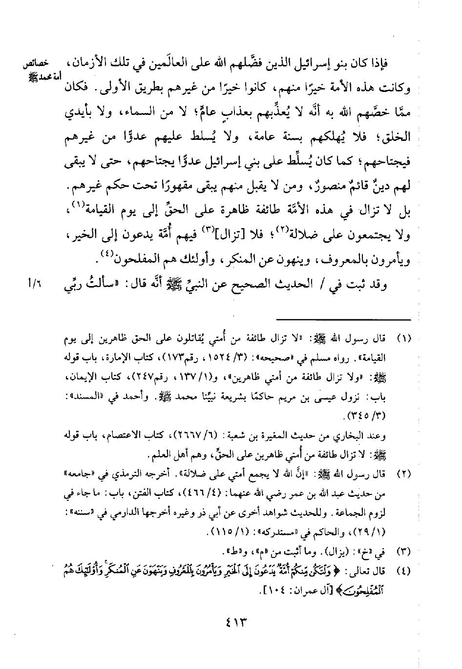 1 قال رسول الله صلى الله عليه وسلم: "لا تزال طائفة من أمتي يُقاتلون على الحق ظاهرين إلى يوم القيامة". رواه مسلم في صحيحه 31524، رقم (173) ، كتاب الإمارة، باب قوله صلى الله عليه وسلم: "ولا تزال طائفة من أمتي ظاهرين "، و1137، رقم (247) ، كتاب الإيمان، باب نزول عيسى بن مريم حاكماً بشريعة نبيّنا محمد صلى الله عليه وسلم. وأحمد في المسند 3345.