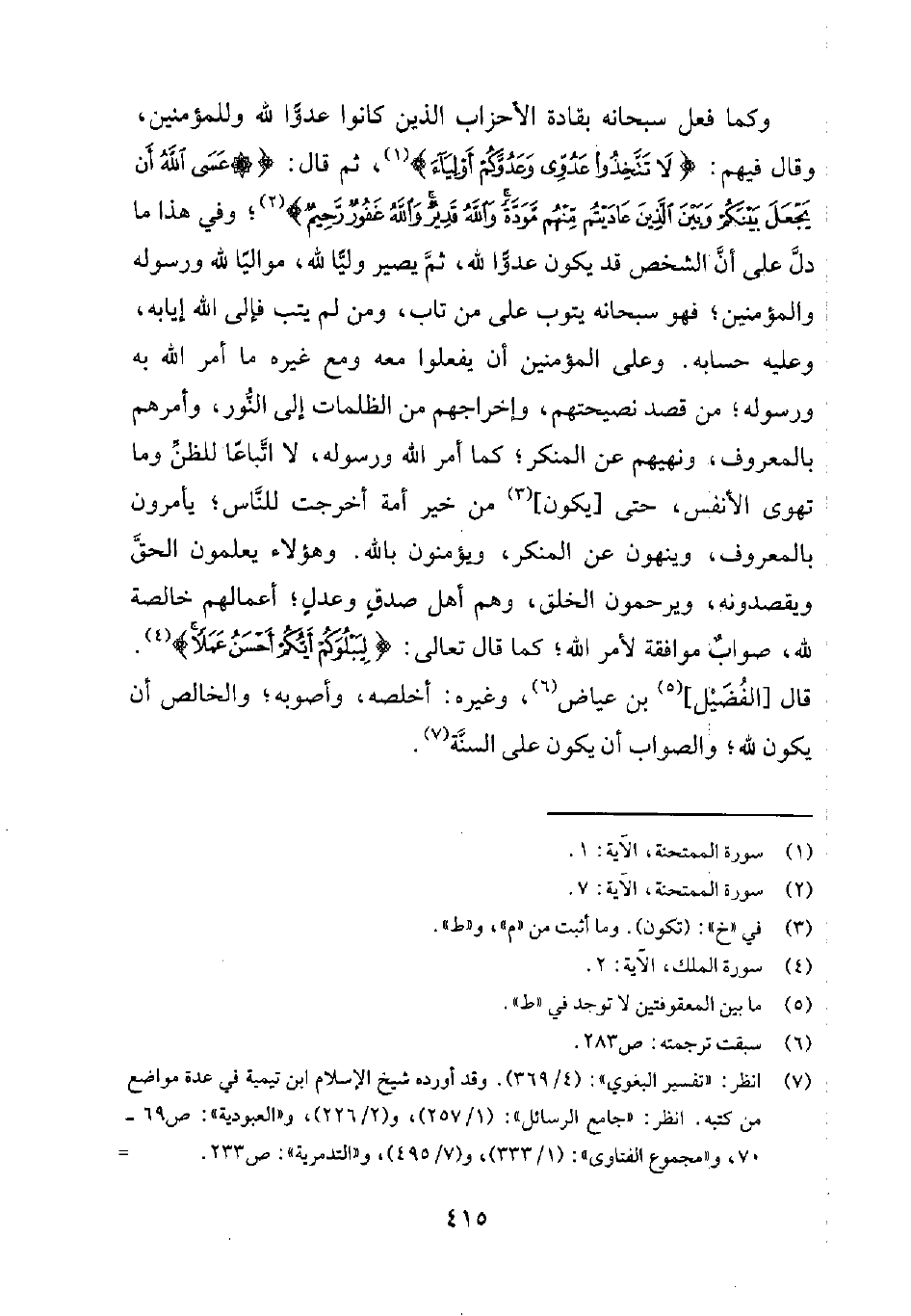 وكما فعل سبحانه بقادة الأحزاب الذين كانوا عدواً لله وللمؤمنين، وقال فيهم: {لا تَتَّخِذُوْا عَدُوِّيْ وَعَدُوَّكُمْ أَوْلِيَاْء} 1، ثمّ قال: {عَسَىْ اللهُ أَنْ يَجْعَلَ بَيْنَكُمْ وَبَيْنَ الَّذِيْنَ عَاْدَيْتُمْ مِنْهُمْ مَوَدَّةٌ وَاللهُ قَدِيْرٌ وَاللهُ غَفُوْرٌ رَحِيْمٌ} 2؛ وفي هذا ما دلّ على أنّ الشخص قد يكون عدواً لله، ثمّ يصير وليّاً لله، موالياً لله ورسوله والمؤمنين؛ فهو سبحانه يتوب على من تاب، ومن لم يتب فإلى الله إيابه، وعليه حسابه. وعلى المؤمنين أن يفعلوا معه ومع غيره ما أمر الله به ورسوله؛ من قصد نصيحتهم، وإخراجهم من الظلمات إلى النّور، وأمرهم بالمعروف، ونهيهم عن المنكر؛ كما أمر الله ورسوله، لا اتّباعاً للظنّ وما تهوى الأنفس، حتى [يكون] 3 من خير أمة أخرجت للنّاس؛ يأمرون بالمعروف، وينهون عن المنكر، ويؤمنون بالله. وهؤلاء يعلمون الحقّ ويقصدونه، ويرحمون الخلق، وهم أهل صدقٍ وعدلٍ؛ أعمالهم خالصة لله، صوابٌ موافقة لأمر الله؛ كما قال تعالى: {لِيَبْلُوَكُمْ أَيُّكُمْ أَحْسَنُ عَمَلاً} 4. قال [الفُضَيْل] 5 بن عياض6، وغيره: أخلصه، وأصوبه؛ والخالص أن يكون لله؛ والصواب أن يكون على السنّة7.