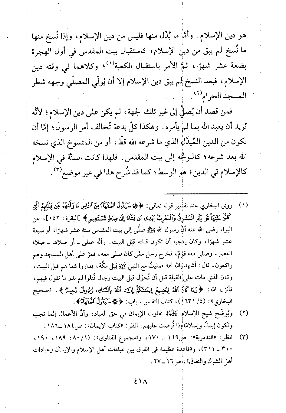 فمن قصد أن يُصلّي إلى غير تلك الجهة، لم يكن على دين الإسلام؛ لأنّه يُريد أن يعبد الله بما لم يأمره. وهكذا كلّ بدعة تُخالف أمر الرسول؛ إمّا أن تكون من الدين المُبدّل الذي ما شرعه الله قطّ، أو من المنسوخ الذي نسخه الله بعد شرعه؛ كالتوجّه إلى بيت المقدس. فلهذا كانت السنّة في الإسلام كالإسلام في الدين؛ هو الوسط؛ كما قد شُرح هذا في غير موضع3.