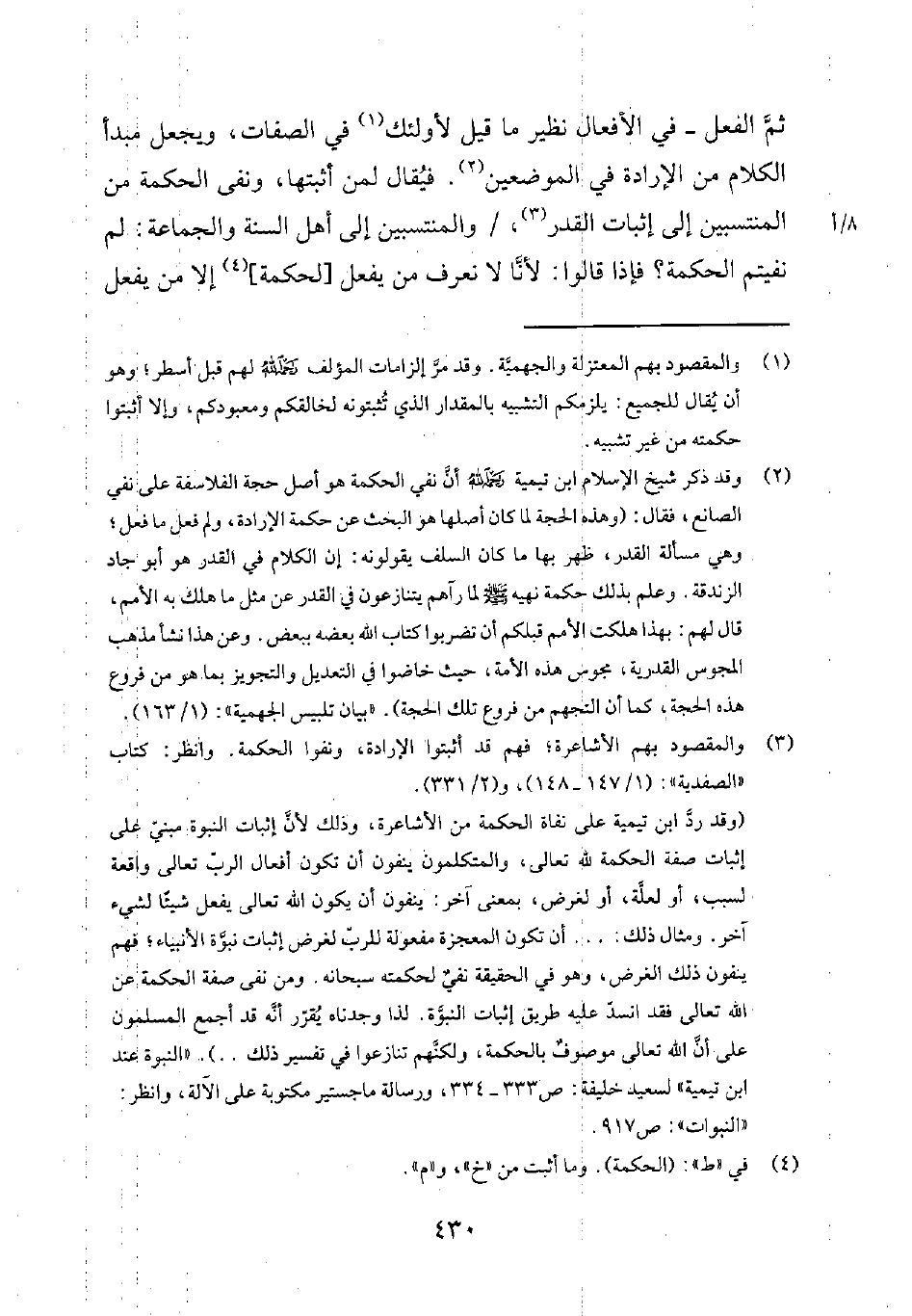3 والمقصود بهم الأشاعرة؛ فهم قد أثبتوا الإرادة، ونفوا الحكمة. وانظر: كتاب الصفدية 1147-148،، 2331.
