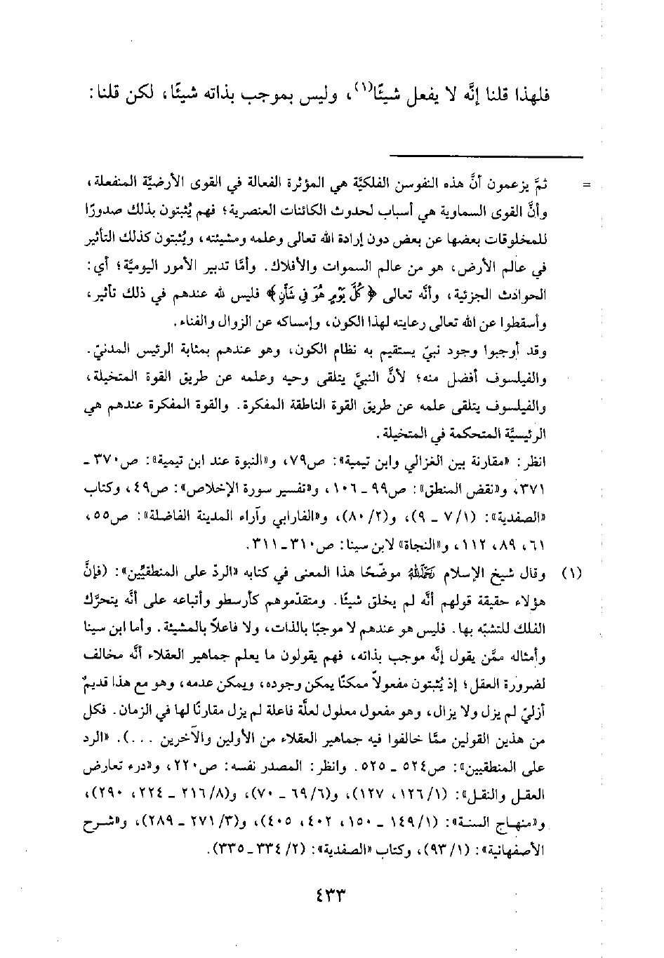 1 وقال شيخ الإسلام رحمه الله موضّحاً هذا المعنى في كتابه الردّ على المنطقيّين: "فإنّ هؤلاء حقيقة قولهم أنّه لم يخلق شيئاً. ومتقدّموهم كأرسطو وأتباعه على أنّه يتحرّك الفلك للتشبّه بها. فليس هو عندهم لا موجباً بالذات، ولا فاعلاً بالمشيئة. وأما ابن سينا وأمثاله ممّن يقول إنّه موجب بذاته، فهم يقولون ما يعلم جماهير العقلاء أنّه مخالف لضرورة العقل؛ إذ يُثبتون مفعولاً ممكناً يمكن وجوده، ويمكن عدمه، وهو مع هذا قديمٌ أزليّ لم يزل ولا يزال، وهو مفعول معلول لعلّة فاعلة لم يزل مقارناً لها في الزمان. فكل من هذين القولين ممّا خالفوا فيه جماهير العقلاء من الأولين والآخرين ... ". الرد على المنطقيين ص 524-525.