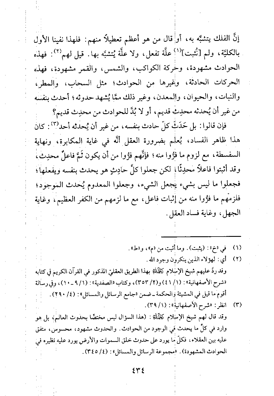 إنّ الفلك يتشبّه به، أو قال من هو أعظم تعطيلاً منهم: فلهذا نفينا الأول بالكليّة، ولم [نُثبت] 1 علّة تفعل، ولا علّة يُتشبّه بها. قيل لهم2: فهذه الحوادث مشهودة، وحركة الكواكب، والشمس، والقمر مشهودة، فهذه الحركات الحادثة، وغيرها من الحوادث؛ مثل السحاب، والمطر، والنبات، والحيوان، والمعدن، وغير ذلك ممّا يُشهد حدوثه؛ أحدث بنفسه من غير أن يُحدثه محدِث قديم، أو لا بُدّ للحوادث من محدِث قديم؟