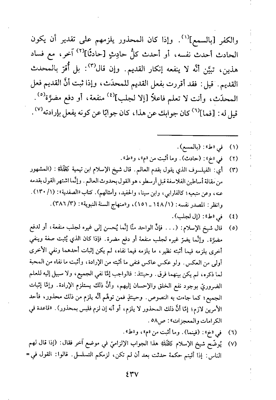 3 أي الفيلسوف الذي يقول بقدم العالم. قال شيخ الإسلام ابن تيمية رحمه الله: "المشهور من مقالة أساطين الفلاسفة قبل أرسطو، هو القول بحدوث العالم. وإنّما اشتهر القول بقدمه عنه، وعن متبعيه؛ كالفارابي، وابن سينا، والحفيد، وأمثالهم". كتاب الصفدية 1130. وانظر: المصدر نفسه 1148-151. ومنهاج السنة النبوية 3386.