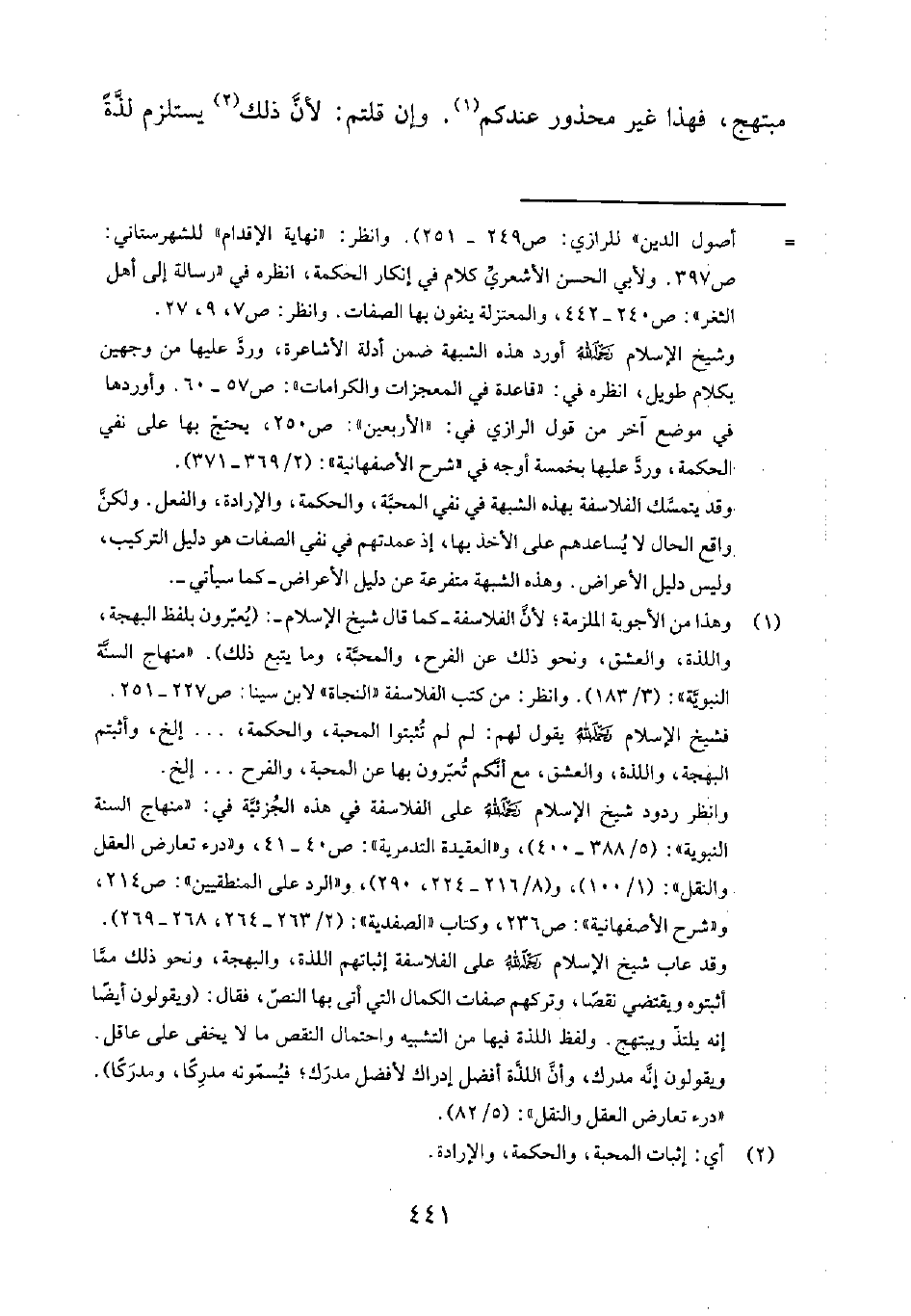 وقد عاب شيخ الإسلام رحمه الله على الفلاسفة إثباتهم اللذة، والبهجة، ونحو ذلك ممّا أثبتوه ويقتضي نقصاً، وتركهم صفات الكمال التي أتى بها النصّ، فقال: "ويقولون أيضاً إنه يلتذّ ويبتهج. ولفظ اللذة فيها من التشبيه واحتمال النقص ما لا يخفى على عاقل. ويقولون إنّه مدرك، وأنّ اللذّة أفضل إدراك لأفضل مدرَك؛ فيُسمّونه مدرِكاً، ومدرَكاً". درء تعارض العقل والنقل 582.
