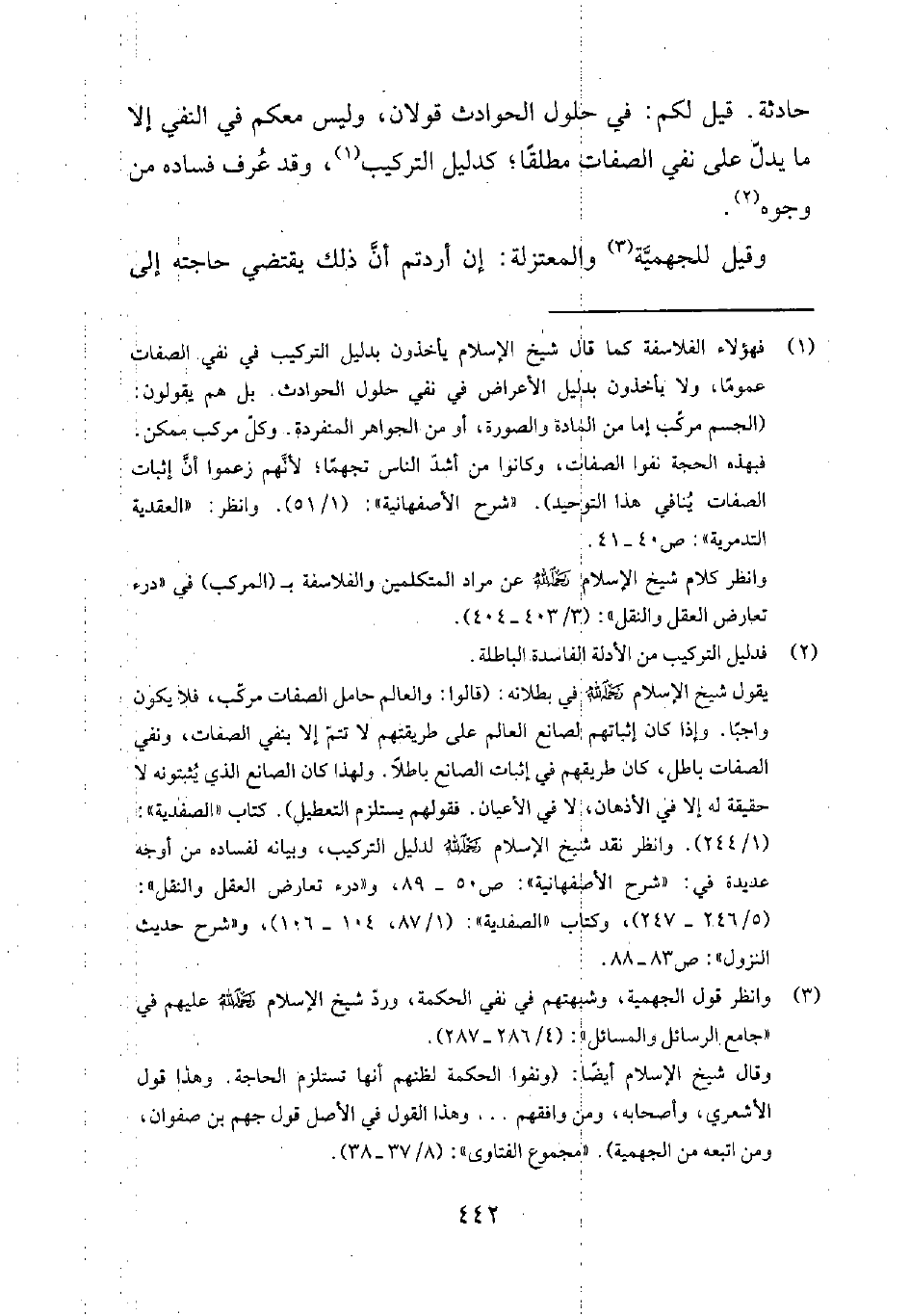 1 فهؤلاء الفلاسفة كما قال شيخ الإسلام يأخذون بدليل التركيب في نفي الصفات عموماً، ولا يأخذون بدليل الأعراض في نفي حلول الحوادث. بل هم يقولون: "الجسم مركّب إما من المادة والصورة، أو من الجواهر المنفردة. وكلّ مركب ممكن. فبهذه الحجة نفوا الصفات، وكانوا من أشدّ الناس تجهماً؛ لأنّهم زعموا أنّ إثبات الصفات يُنافي هذا التوحيد..". شرح الأصفهانية 151. وانظر: العقيدة التدمرية ص 40-41.