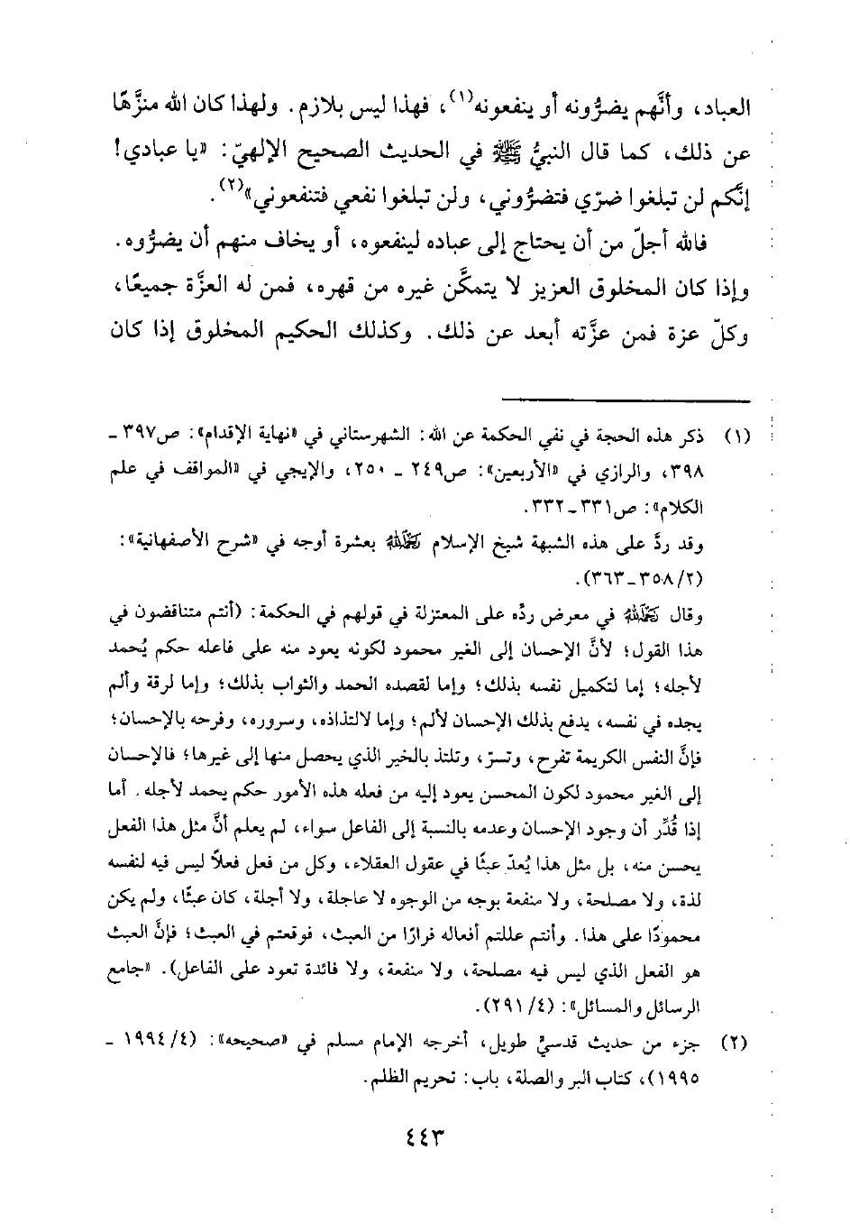 1 ذكر هذه الحجة في نفي الحكمة عن الله: الشهرستاني في نهاية الإقدام ص 397-398. والرازي في الأربعين ص 249-250. والإيجي في المواقف في علم الكلام ص 331-332.