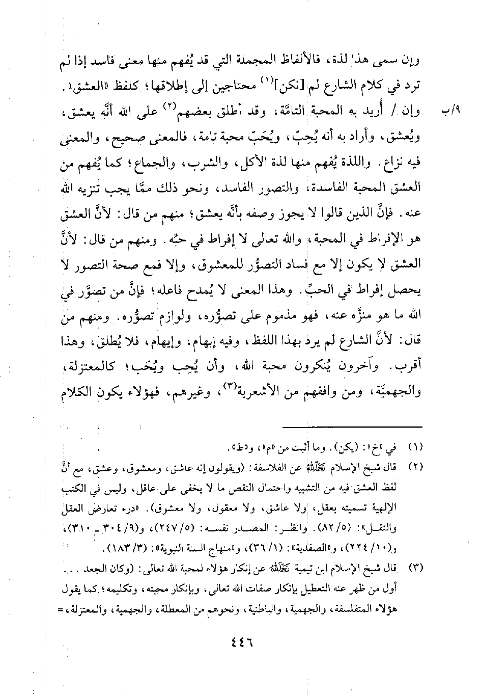 2 قال شيخ الإسلام رحمه الله عن الفلاسفة: "ويقولون إنه عاشق، ومعشوق، وعشق. مع أنّ لفظ العشق فيه من التشبيه واحتمال النقص ما لا يخفى على عاقل. وليس في الكتب الإلهية تسميته بعقل، ولا عاشق، ولا معقول، ولا معشوق". درء تعارض العقل والنقل 582. وانظر: المصدر نفسه 5247،، 9304-310، 10224 والصفدية 136. ومنهاج السنة النبوية 3183.