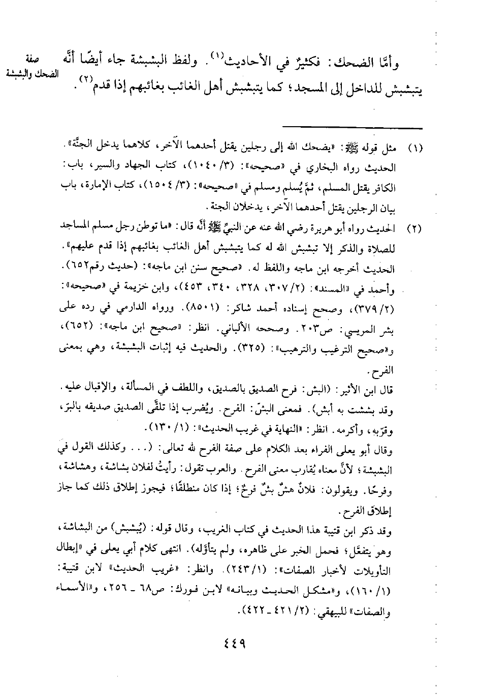 وقد ذكر ابن قتيبة هذا الحديث في كتاب الغريب، وقال قوله: (يُبشبش) من البشاشة، وهو يتفعَّل؛ فحمل الخبر على ظاهره، ولم يتأوّله". انتهى كلام أبي يعلى في إبطال التأويلات لأخبار الصفات 1243. وانظر: غريب الحديث لابن قتيبة 1160. ومشكل الحديث وبيانه لابن فورك ص 68، 256. والأسماء والصفات للبيهقي 2421-422.