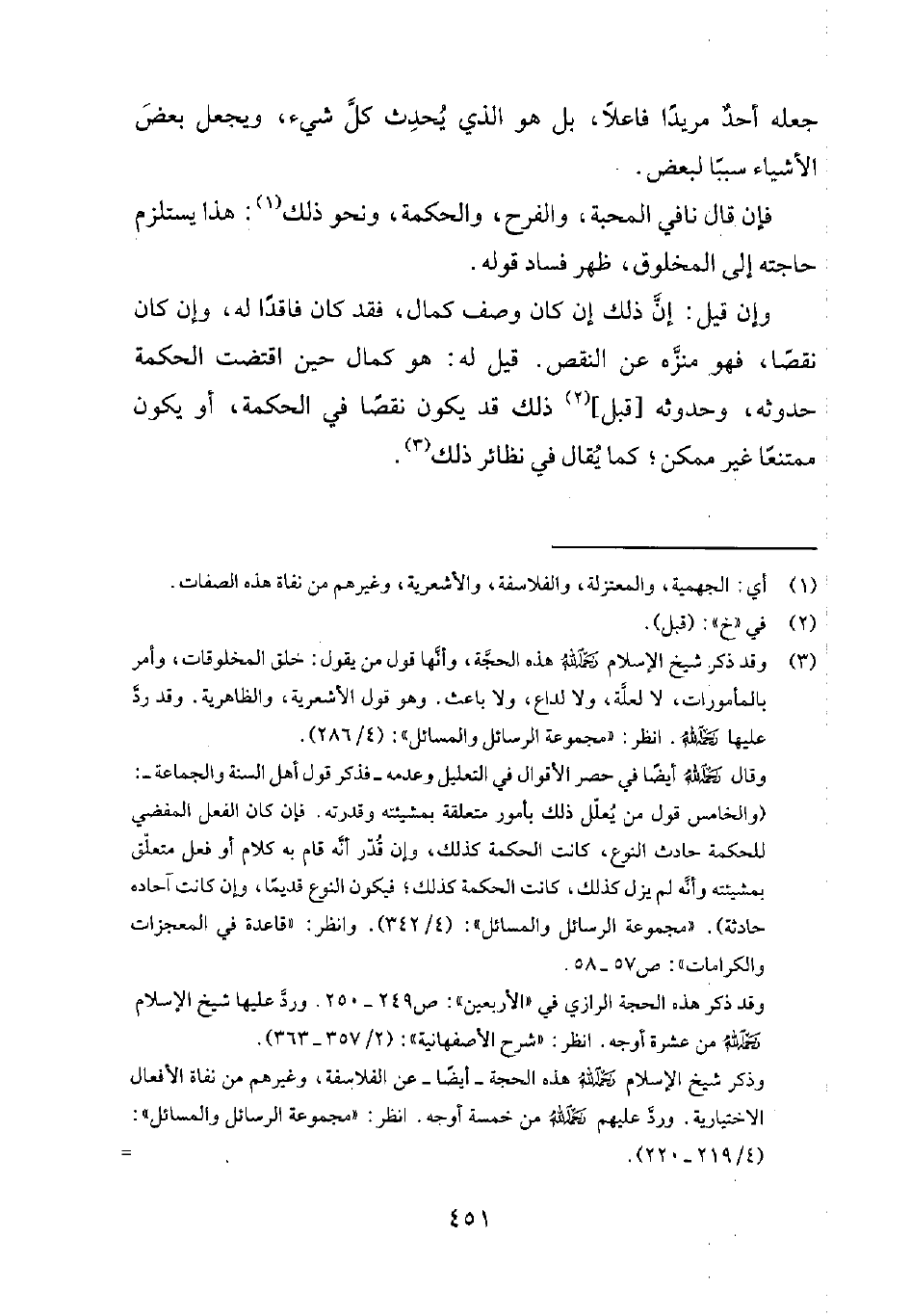 3 وقد ذكر شيخ الإسلام رحمه الله هذه الحجّة، وأنّها قول من يقول: "خلق المخلوقات، وأمر بالمأمورات، لا لعلّة، ولا لداع، ولا باعث. وهو قول الأشعرية، والظاهرية". وقد ردّ عليها رحمه الله. انظر: مجموعة الرسائل والمسائل 4286.