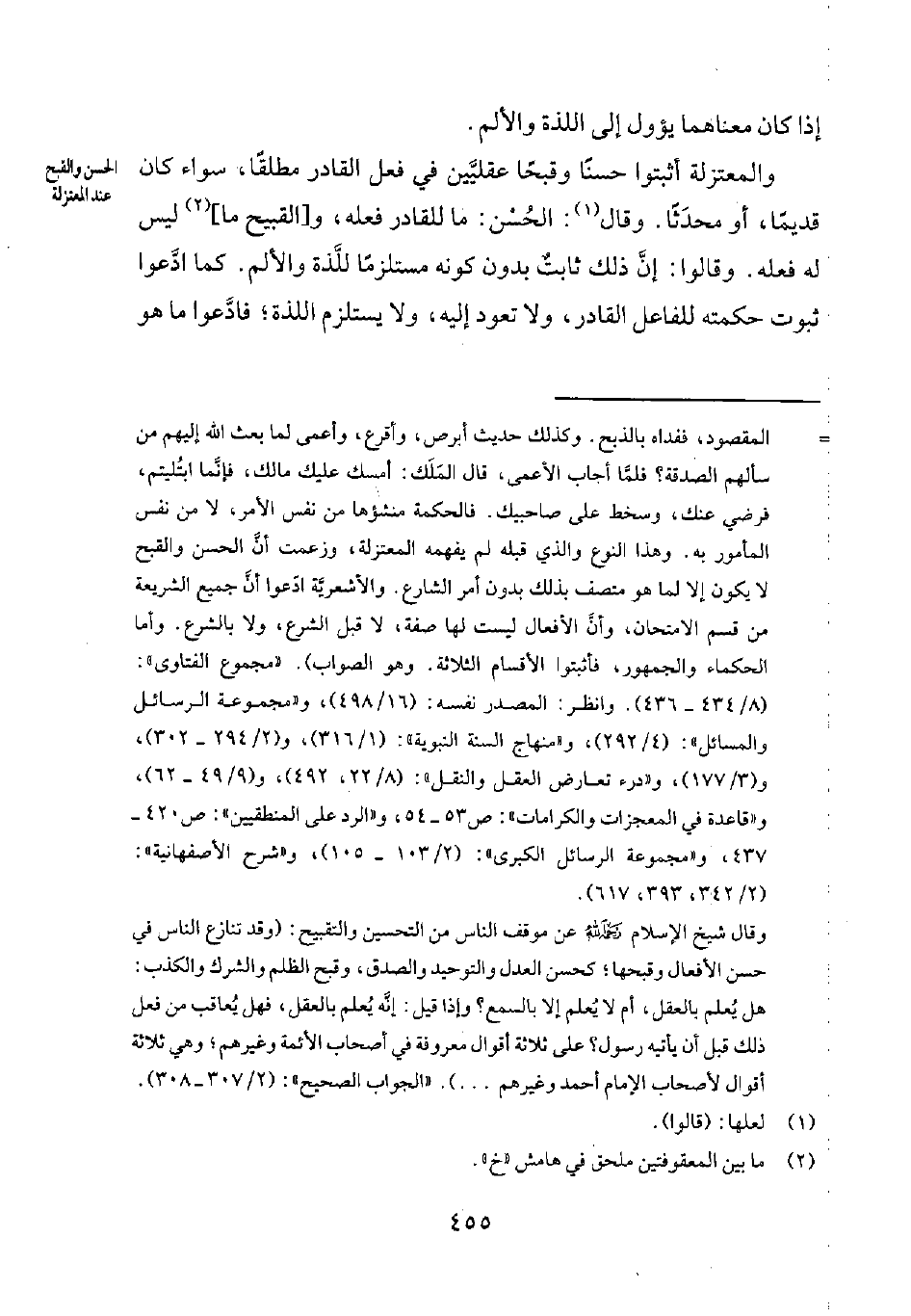 والمعتزلة أثبتوا حسناً وقبحاً عقليّين في فعل القادر مطلقاً، سواء كان قديماً، أو محدَثاً. وقال1: الحُسْن: ما للقادر فعله. و [القبيح ما] 2 ليس له فعله. وقالوا: إنّ ذلك ثابتٌ بدون كونه مستلزماً للّذة والألم. كما ادّعوا ثبوت حكمته للفاعل القادر، ولا تعود إليه، ولا يستلزم اللذة؛ فادّعوا ما هو