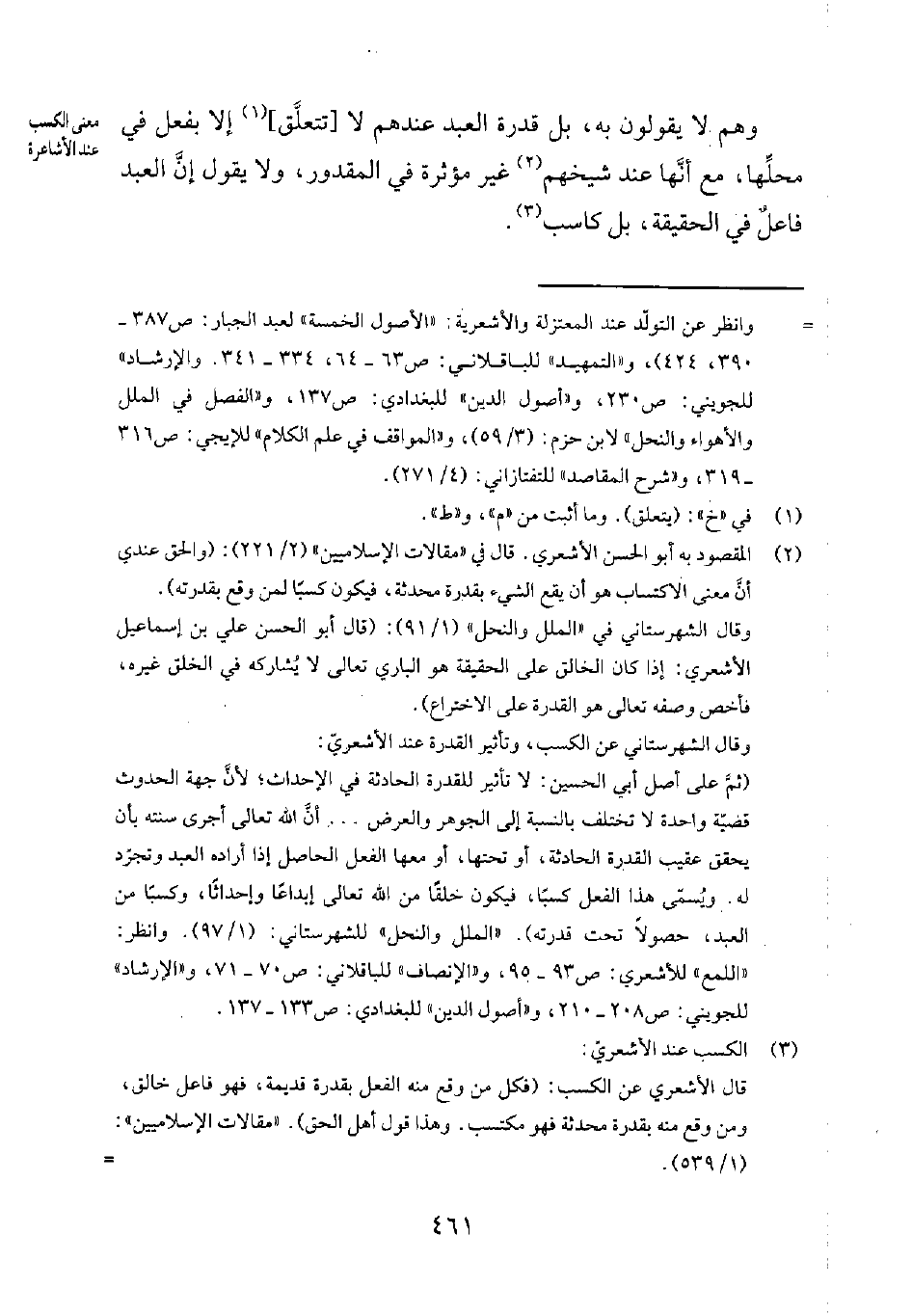2 المقصود به أبو الحسن الأشعري. قال في مقالات الإسلاميين 2221: (والحق عندي أنّ معنى الاكتساب هو أن يقع الشيء بقدرة محدثة، فيكون كسباً لمن وقع بقدرته) .