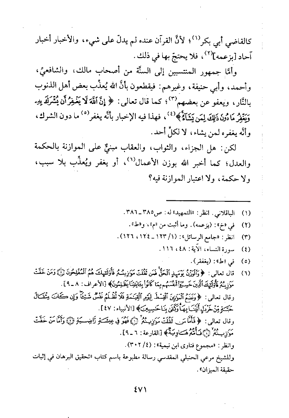 لكن: هل الجزاء، والثواب، والعقاب مبنيٌ على الموازنة بالحكمة والعدل؛ كما أخبر الله بوزن الأعمال6، أو يغفر ويُعذّب بلا سبب، ولا حكمة، ولا اعتبار الموازنة فيه؟