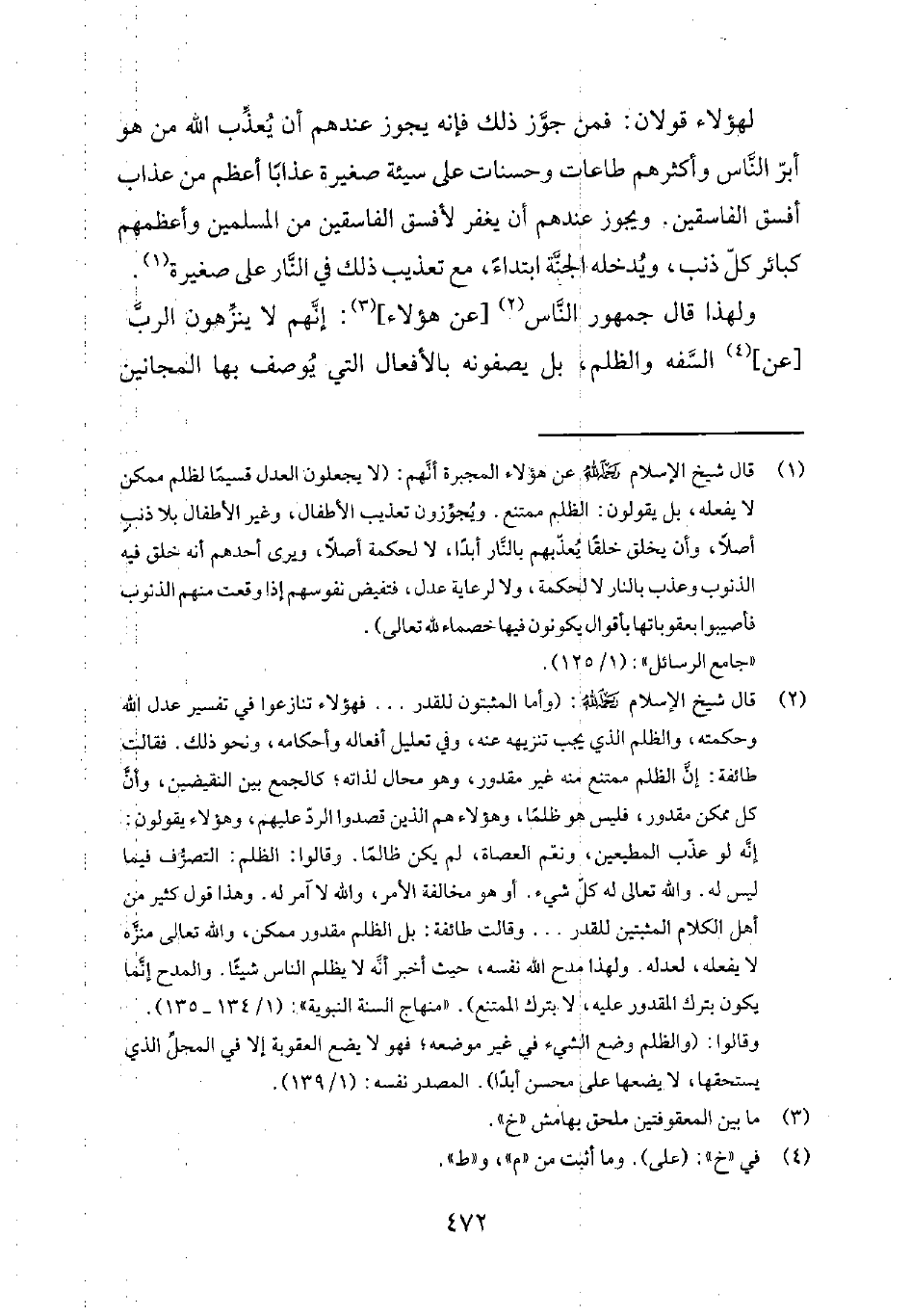 1 قال شيخ الإسلام رحمه الله عن هؤلاء المجبرة أنّهم: "لايجعلون العدل قسيماً لظلم ممكن لا يفعله، بل يقولون: الظلم ممتنع. ويُجوّزون تعذيب الأطفال، وغير الأطفال بلا ذنبٍ أصلاً، وأن يخلق خلقاً يُعذّبهم بالنّار أبداً، لا لحكمة أصلاً، ويرى أحدهم أنه خلق فيه الذنوب وعذب بالنار لا لحكمة، ولا لرعاية عدل، فتفيض نفوسهم إذا وقعت منهم الذنوب فأصيبوا بعقوباتها بأقوال يكونون فيها خصماء لله تعالى". جامع الرسائل 1125.