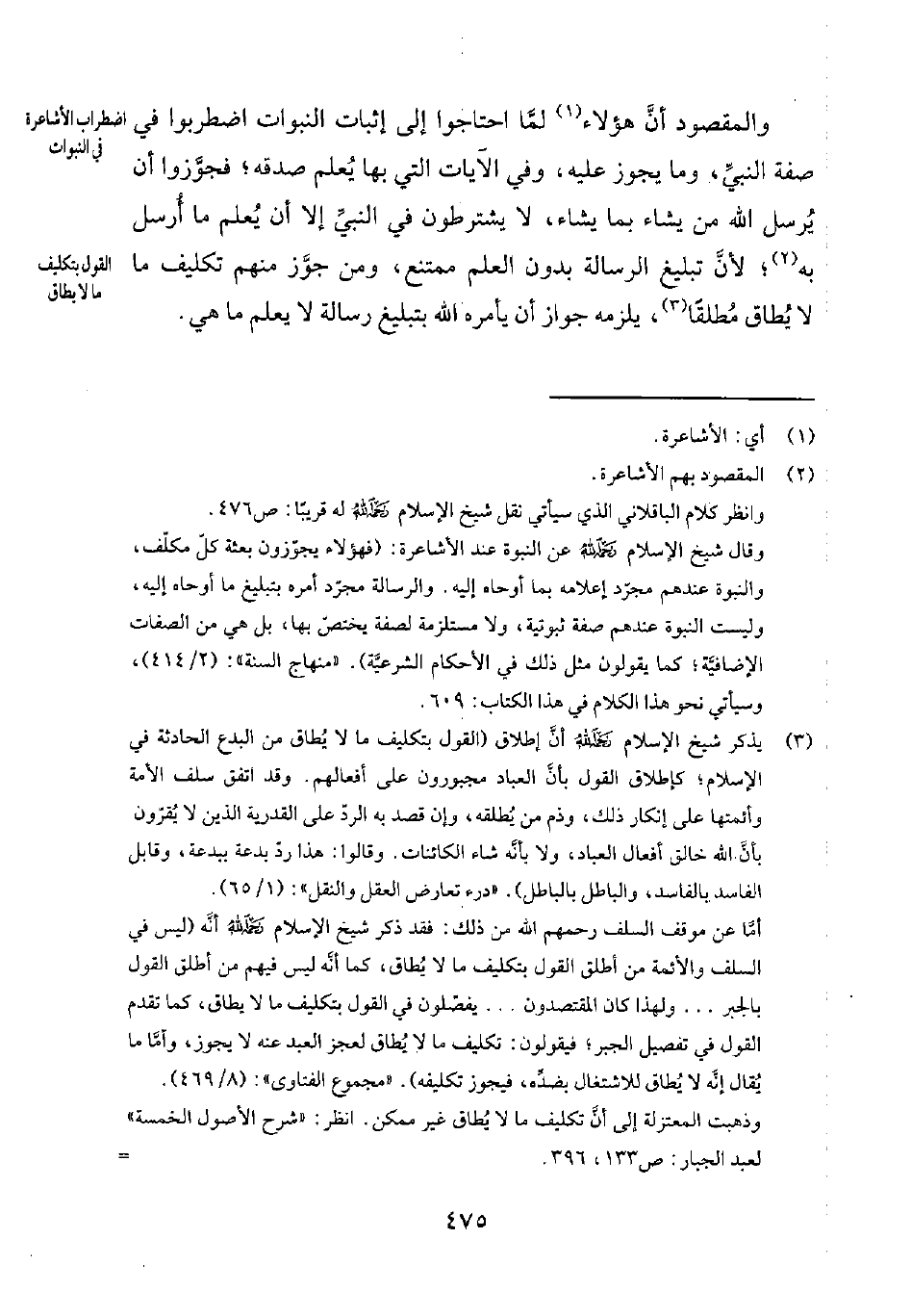 3 يذكر شيخ الإسلام رحمه الله أنّ إطلاق "القول بتكليف ما لا يُطاق من البدع الحادثة في الإسلام؛ كإطلاق القول بأنّ العباد مجبورون على أفعالهم. وقد اتفق سلف الأمة وأئمتها على إنكار ذلك، وذم من يُطلقه، وإن قصد به الردّ على القدرية الذين لا يُقرّون بأنّ الله خالق أفعال العباد، ولا بأنّه شاء الكائنات. وقالوا: هذا ردّ بدعة ببدعة، وقابل الفاسد بالفاسد، والباطل بالباطل". درء تعارض العقل والنقل 165.