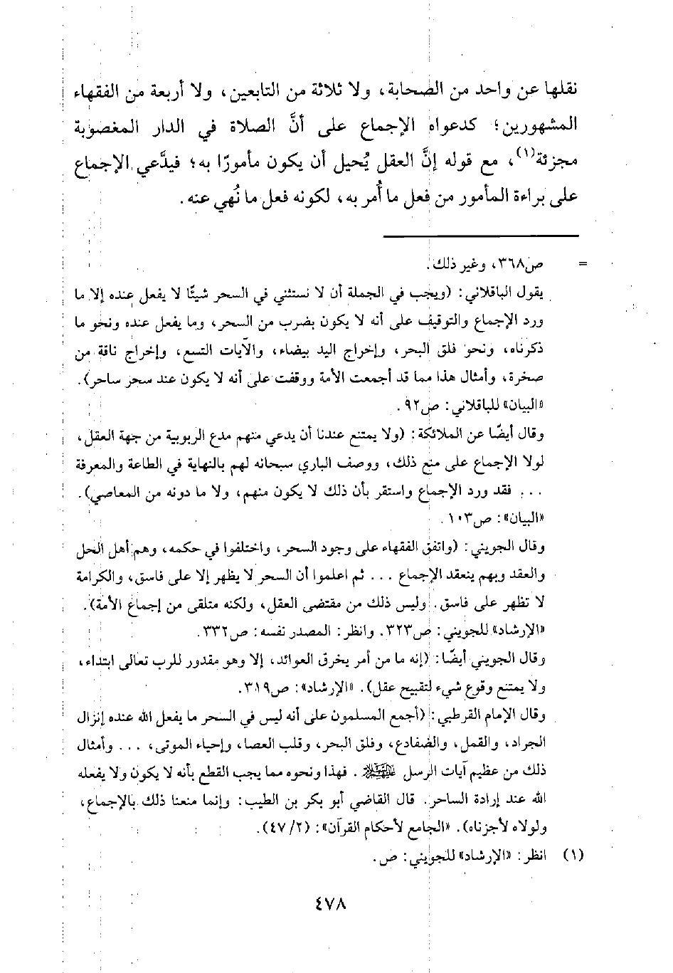 نقلها عن واحد من الصحابة، ولا ثلاثة من التابعين، ولا أربعة من الفقهاء المشهورين؛ كدعواه الإجماع على أنّ الصلاة في الدار المغصوبة مجزئة1، مع قوله أنّ العقل يُحيل أن يكون مأموراً به؛ فيدّعي الإجماع على براءة المأمور من فعل ما أُمر به، لكونه فعل ما نُهي عنه.