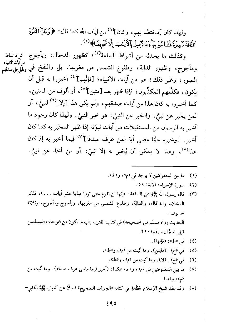 وكذلك ما يحدثه من أشراط الساعة3؛ كظهور الدجال، ويأجوج ومأجوج، وظهور الدابة، وطلوع الشمس من مغربها، بل والنفخ في الصور، وغير ذلك؛ هو من آيات الأنبياء؛ [فإنّهم] 4 أخبروا به قبل أن يكون، فكذّبهم المكذّبون، فإذا ظهر بعد [مئين] 5، أو ألوف من السنين، كما أخبروا به كان هذا من آيات صدقهم، ولم يكن هذا [إلا] 6 لنبيّ، أو لمن يخبر عن نبيّ. والخبر عن النبيّ: هو خبر النبيّ. ولهذا كان وجود ما أخبر به الرسول من المستقبلات من آيات نبوّته إذا ظهر المخبَر به كما كان أخبر. [وخبره عمّا مضى آية لمن عرف صدقه] 7 فيما أخبر به إذ كان هذا8. وهذا لا يمكن أن يُخبر به إلا نبيّ، أو من أخذ عن نبيّ.