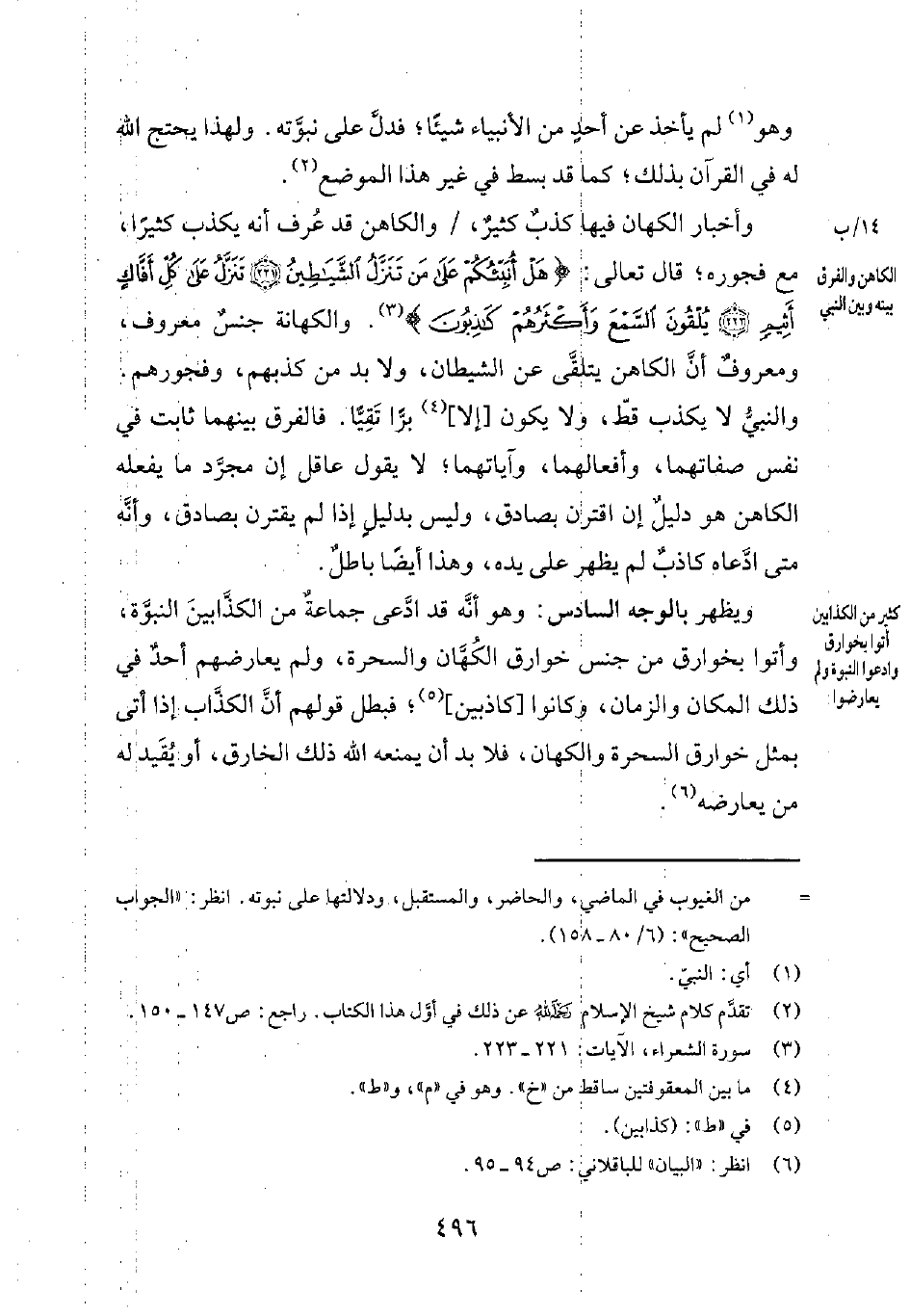 وأخبار الكهان فيها كذبٌ كثيرٌ، والكاهن قد عُرف أنه يكذب كثيراً، مع فجوره؛ قال تعالى: {هَلْ أُنَبِّئُكُمْ عَلَى مَنْ تَنَزَّلُ الشَّيَاطِينُ تَنَزَّلُ عَلى كلِّ أَفَّاكٍ أَثِيمٍ يُلْقُوْنَ السَّمْعَ وَأَكْثَرُهُمْ كَاْذِبُوْنَ} 3. والكهانة جنسٌ معروف، ومعروفٌ أنّ الكاهن يتلقّى عن الشيطان، ولا بد من كذبهم، وفجورهم. والنبيّ لا يكذب قطّ، ولا يكون [إلا] 4 برّاً تَقِيَّاً. فالفرق بينهما ثابت في نفس صفاتهما، وأفعالهما، وآياتهما؛ لا يقول عاقل إنّ مجرّد ما يفعله الكاهن هو دليلٌ إن اقترن بصادق، وليس بدليلٍ إذا لم يقترن بصادق، وأنّه متى ادّعاه كاذبٌ لم يظهر على يده. وهذا أيضاً باطلٌ.