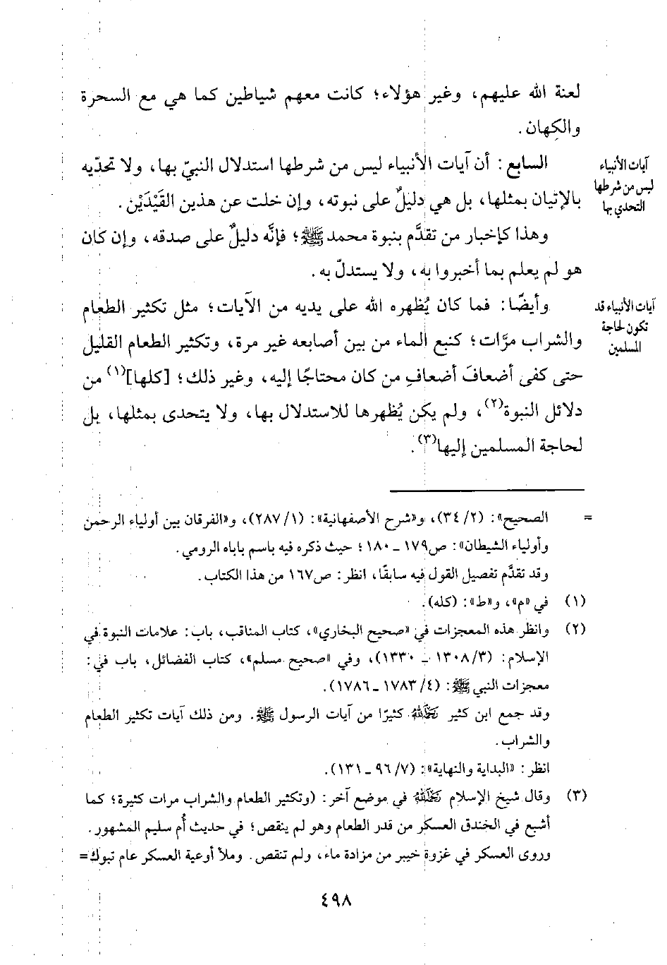 وأيضاً: فما كان يُظهره الله على يديه من الآيات؛ مثل تكثير الطعام والشراب مرّات؛ كنبع الماء من بين أصابعه غير مرة، وتكثير الطعام القليل حتى كفى أضعافَ أضعافِ من كان محتاجاً إليه، وغير ذلك؛ [كلها] 1 من دلائل النبوة2، ولم يكن يُظهرها للاستدلال بها، ولا يتحدى بمثلها، بل لحاجة المسلمين إليها3.
