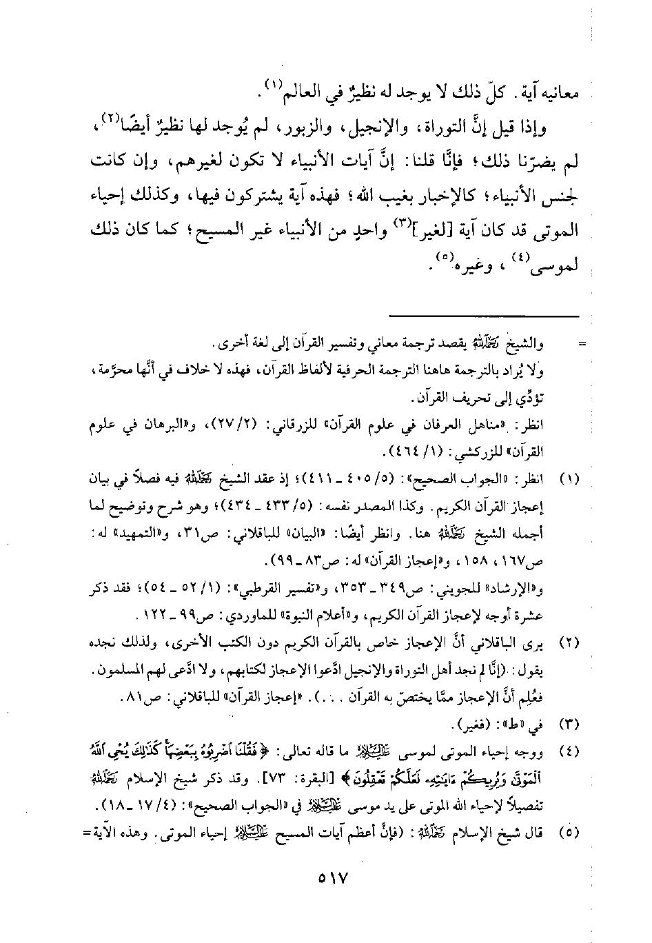 1 انظر: الجواب الصحيح 5/405-411؛ إذ عقد الشيخ رحمه الله فيه فصلاً في بيان إعجاز القرآن الكريم. وكذا المصدر نفسه 5/433-434؛ وهو شرح وتوضيح لما أجمله الشيخ رحمه الله هنا.