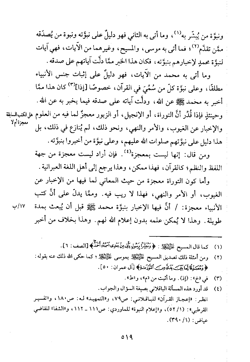 ومن قال: إنها ليست بمعجزة4. فإن أراد ليست معجزة من جهة اللفظ والنظم؛ كالقرآن، فهذا ممكن. وهذا يرجع إلى أهل اللغة العبرانية.