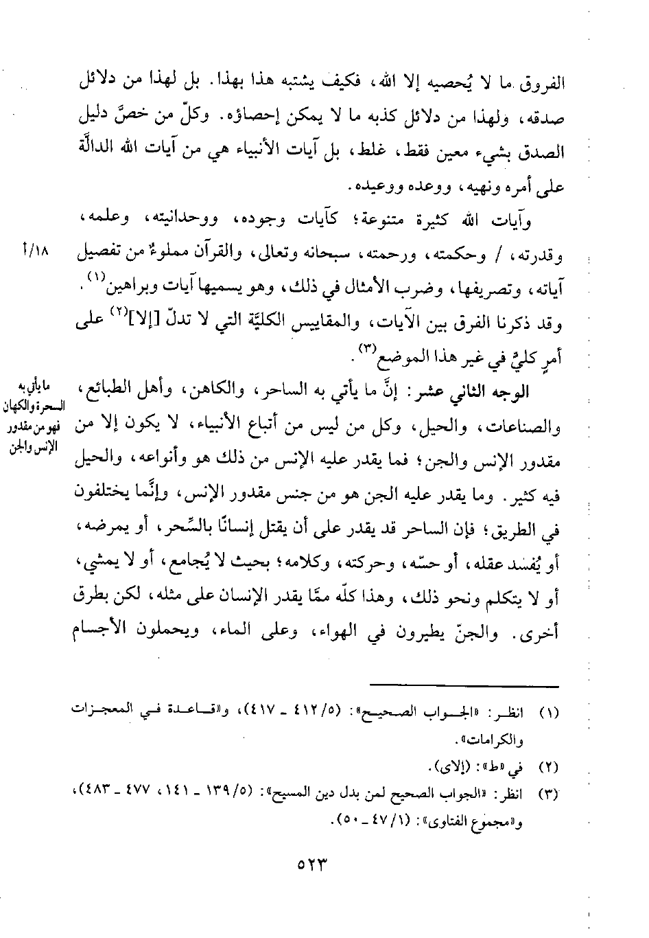 الوجه الثاني عشر: إنّ ما يأتي به الساحر، والكاهن، وأهل الطبائع، والصناعات، والحيل، وكل من ليس من أتباع الأنبياء، لا يكون إلا من مقدور الإنس والجن؛ فما يقدر عليه الإنس من ذلك هو وأنواعه، والحيل فيه كثير. وما يقدر عليه الجن هو من جنس مقدور الإنس، وإنّما يختلفون في الطريق؛ فإن الساحر قد يقدر على أن يقتل إنساناً بالسّحر، أو يمرضه، أو يُفسد عقله، أو حسّه، وحركته، وكلامه؛ بحيث لا يُجامع، أو لا يمشي، أو لا يتكلم ونحو ذلك. وهذا كلّه ممّا يقدر الإنس على مثله، لكن بطرق أخرى. والجنّ يطيرون في الهواء، وعلى الماء، ويحملون الأجسام