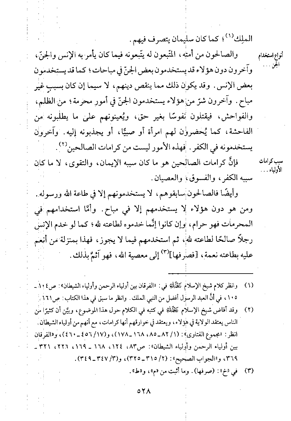 والصالحون من أمته، المتّبعون له يتّبعونه فيما كان يأمر به الإنس والجنّ. وآخرون دون هؤلاء قد يستخدمون بعض الجنّ في مباحات؛ كما قد يستخدمون بعض الإنس. وقد يكون ذلك مما ينقص دينهم، لا سيما إن كان بسببٍ غير مباح. وآخرون شرّ من هؤلاء يستخدمون الجنّ في أمور محرمة؛ من الظلم، والفواحش، فيقتلون نفوساً بغير حق، ويُعينونهم على ما يطلبونه من الفاحشة، كما يُحضرون لهم امرأة أو صبياً، أو يجذبونه إليه. وآخرون يستخدمونهم في الكفر. فهذه الأمور ليست من كرامات الصالحين2.