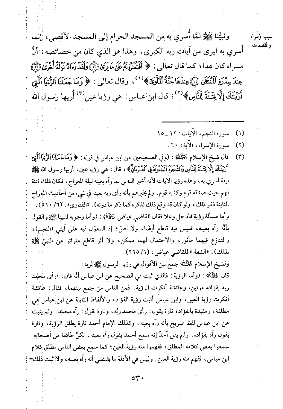 3 قال شيخ الإسلام رحمه الله: "وفي الصحيحين عن ابن عباس في قوله: {وَمَا جَعَلْنَا الرُّؤْيا الَّتِي أَرَيْنَاكَ إِلَّا فِتْنَةً لِلنَّاسِ وَالشَّجَرَةَ الْمَلْعُونَةَ فِي الْقُرْآنِ} قال: هي رؤيا عين، أريها رسول الله صلى الله عليه وسلم ليلة أسري به، وهذه رؤيا الآيات لأنه أخبر النسا بما رآه بعينه ليلة المعراج، فكان ذلك فتنة لهم حيث صدقه قوم وكذبه قوم، ولم يخبرهم بأنه رآى ربه بعينه في شيء من أحاديث المعراج الثابتة ذكر ذلك، ولو كان قد وقع ذلك لذكره كما ذكر ما دونه) . الفتاوى 6/510.