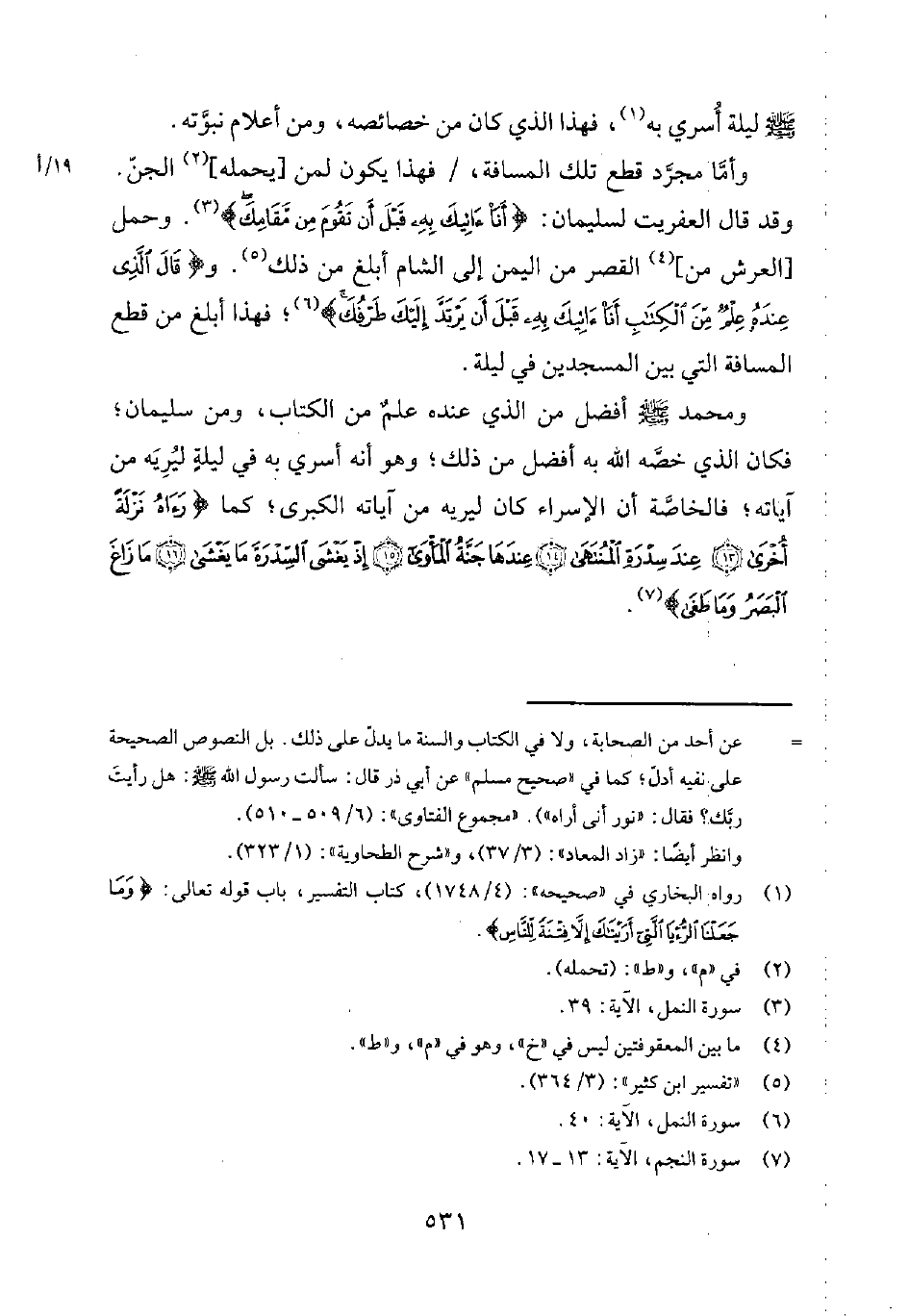 وأمّا مجرّد قطع تلك المسافة، فهذا يكون لمن [يحمله] 2 الجنّ. وقد قال العفريت لسليمان: {أَنَا آتِيكَ بِهِ قَبْلَ أَنْ تَقُومَ مِنْ مَقَامِكَ} 3. وحمل [العرش من] 4 القصر من اليمن إلى الشام أبلغ من ذلك5. و {قَالَ الَّذِي عِنْدَهُ عِلْمٌ مِنَ الكِتَابِ أَنَا آتِيكَ بِهِ قَبْلَ أَنْ يَرْتَدَّ إِلَيْكَ طَرْفُكَ} 6؛ فهذا أبلغ من قطع المسافة التي بين المسجدين في ليلة.