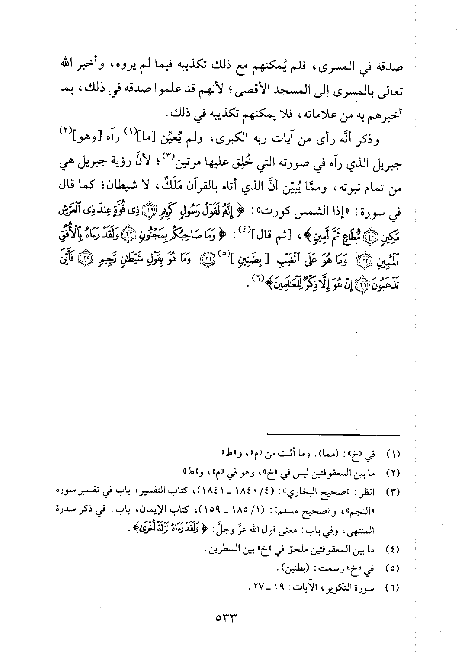 3 انظر: صحيح البخاري 4/1840-1841، كتاب التفسير، باب في تفسير سورة "النجم". وصحيح مسلم 1/158-159، كتاب الإيمان، باب في ذكر سدرة المنتهى. وفي باب معنى قول الله عزّ وجلّ: {وَلَقَدْ رَآهُ نَزْلَةً أُخْرَى} .
