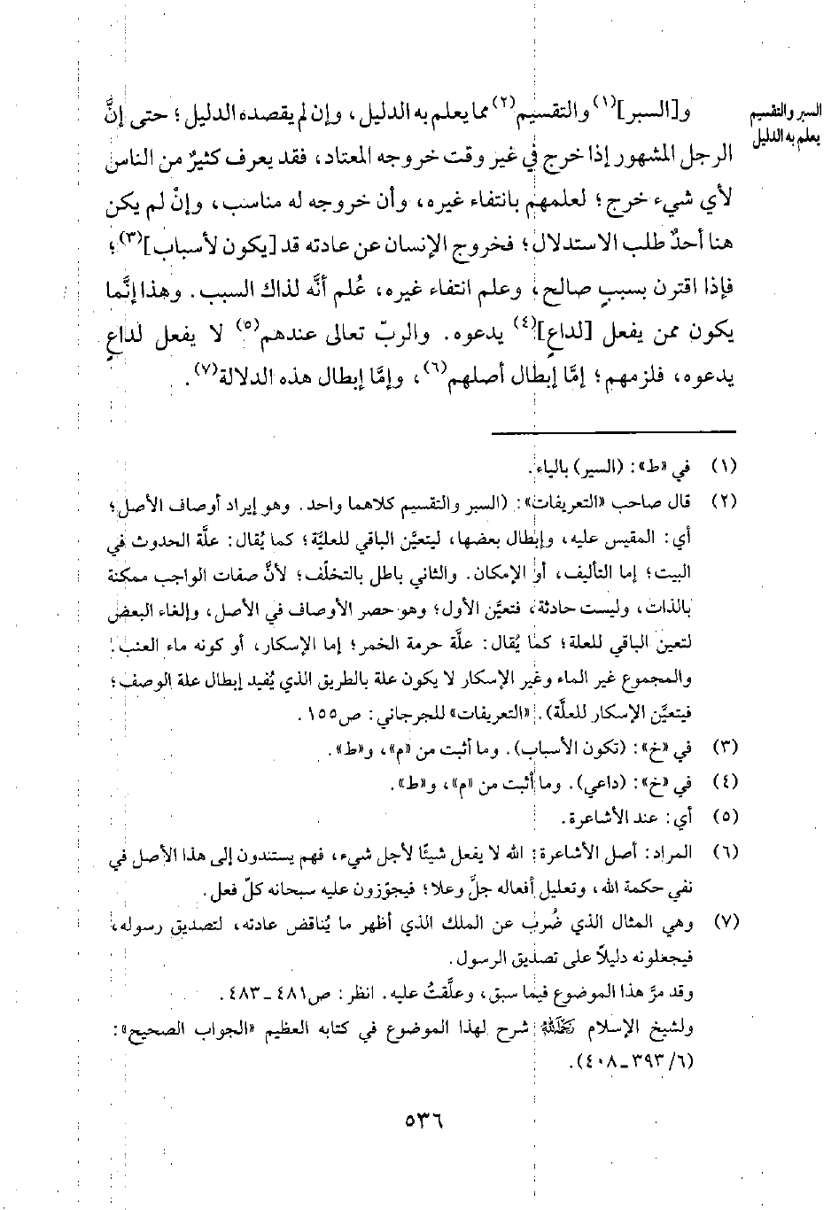2 قال صاحب التعريفات: "السبر والتقسيم كلاهما واحد. وهو إيراد أوصاف الأصل؛ أي المقيس عليه، وإبطال بعضها، ليتعيّن الباقي للعليّة؛ كما يُقال: علّة الحدوث في البيت؛ إما التأليف، أو الإمكان. والثاني باطل بالتخلّف؛ لأنّ صفات الواجب ممكنة بالذات، وليست حادثة، فتعيّن الأول؛ وهو حصر الأوصاف في الأصل، وإلغاء البعض لتعين الباقي للعلة؛ كما يُقال: علّة حرمة الخمر؛ إما الإسكار، أو كونه ماء العنب. والمجموع غير الماء وغير الإسكار لا يكون علة بالطريق الذي يُفيد إبطال علة الوصف؛ فيتعيّن الإسكار للعلّة". التعريفات للجرجاني ص 155.