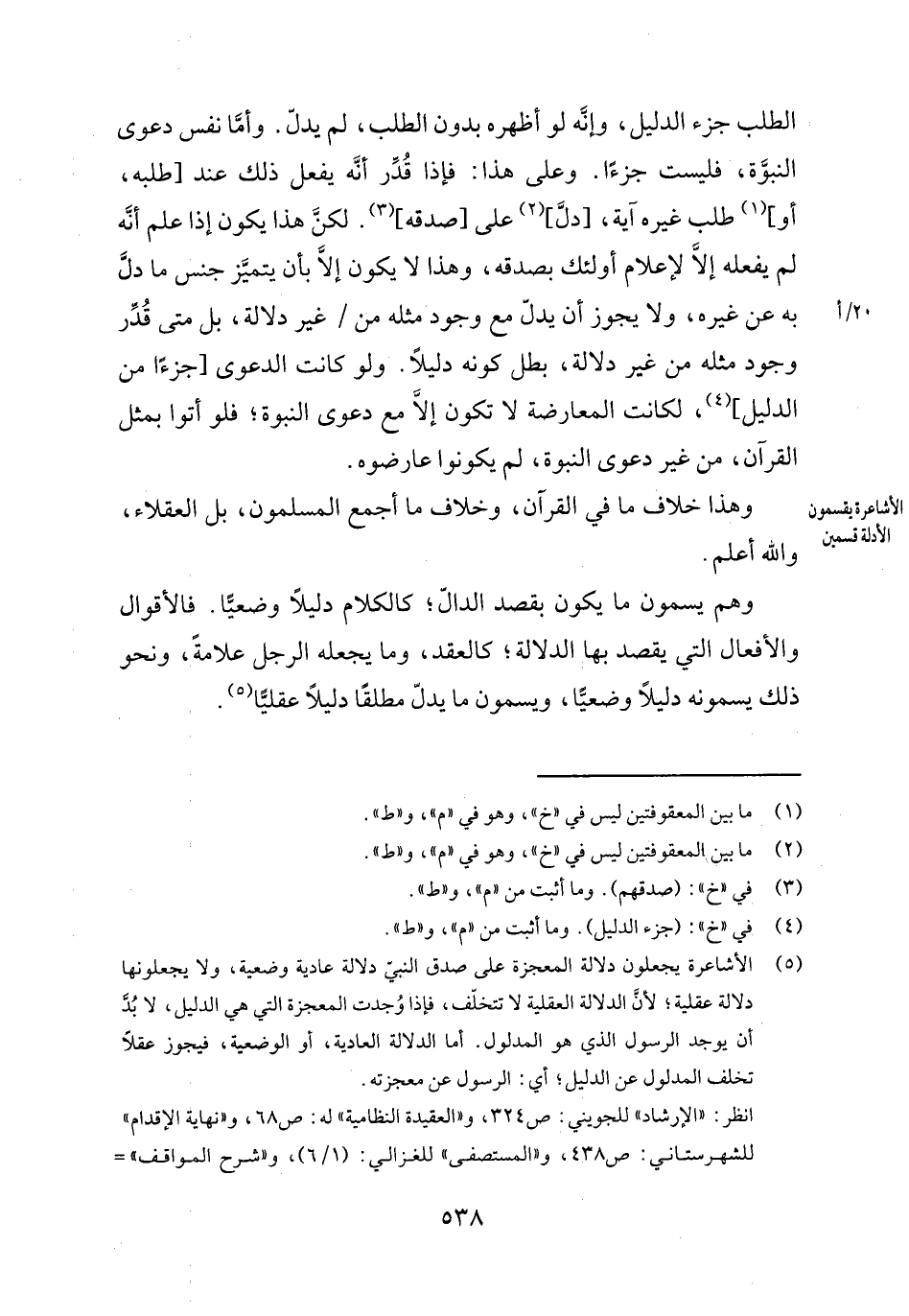 5 الأشاعرة يجعلون دلالة المعجزة على صدق النبيّ دلالة عادية وضعية، ولا يجعلونها دلالة عقلية؛ لأنّ الدلالة العقلية لا تتخلّف، فإذا وُجدت المعجزة التي هي الدليل، لا بُدّ أن يوجد الرسول الذي هو المدلول. أما الدلالة العادية، أو الوضعية، فيجوز عقلاً تخلف المدلول عن الدليل؛ أي الرسول عن معجزته.