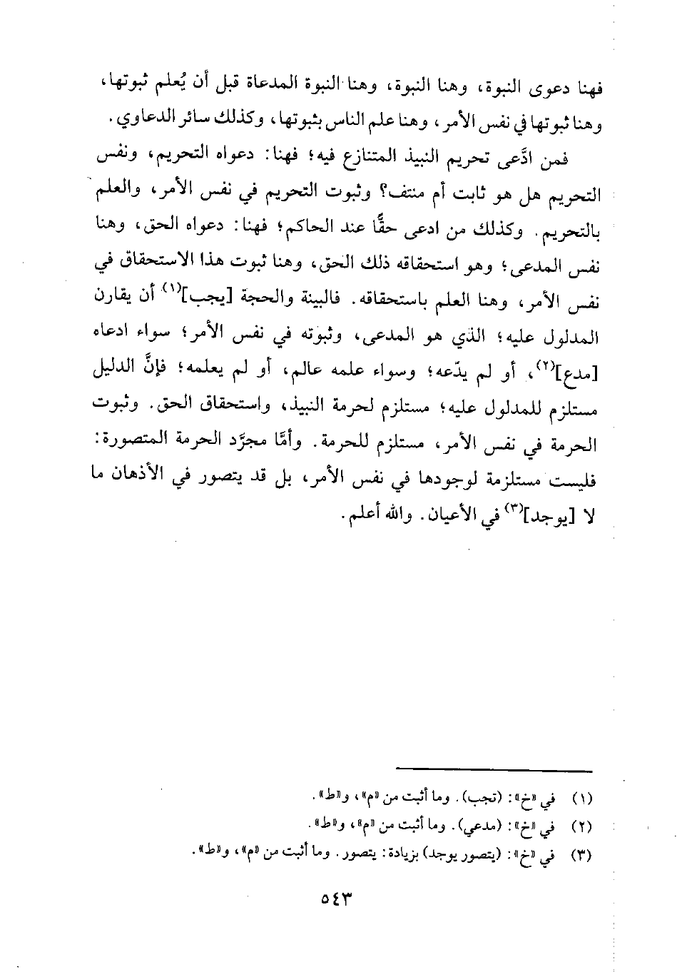 فمن ادّعى تحريم النبيذ المتنازع فيه؛ فهنا: دعواه التحريم، ونفس التحريم هل هو ثابت أم منتف؟ وثبوت التحريم في نفس الأمر، والعلم بالتحريم. وكذلك من ادعى حقاً عند الحاكم؛ فهنا: دعواه الحق، وهنا نفس المدعى؛ وهو استحقاقه ذلك الحق، وهنا ثبوت هذا الاستحقاق في نفس الأمر، وهنا العلم باستحقاقه. فالبينة والحجة [يجب] 1 أن يقارن المدلول عليه؛ الذي هو المدعى، وثبوته في نفس الأمر؛ سواء ادعاه [مدع] 2، أو لم يدّعه؛ وسواء علمه عالم، أو لم يعلمه؛ فإنّ الدليل مستلزم للمدلول عليه؛ مستلزم لحرمة النبيذ، واستحقاق الحق. وثبوت الحرمة في نفس الأمر، مستلزم للحرمة. وأمّا مجرّد الحرمة المتصورة: فليست مستلزمة لوجودها في نفس الأمر، بل قد يتصور في الأذهان ما لا [يوجد] 3 في الأعيان. والله أعلم.