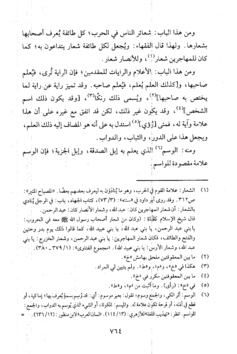 ومن هذا الباب: شعائر الناس في الحرب؛ كلّ طائفة يُعرف أصحابها بشعارها. ولهذا قال الفقهاء: ويُجعل لكلّ طائفة شعار يتداعون به؛ كما كان للمهاجرين شعار1، وللأنصار شعار.