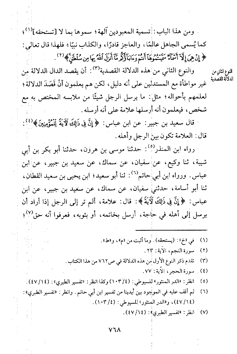 ومن هذا الباب: تسمية المعبودين آلهة؛ سمّوها بما لا [تستحقّه] 1؛ كما يُسمّى الجاهل عالماً، والعاجز قادراً، والكذَّاب نبيّاً؛ فلهذا قال تعالى: {إِنْ هِيَ إِلاَّ أَسْمَاءٌ سَمَّيْتُمُوهَا أَنْتُمْ وَآبَاؤُكُمْ مَا أَنْزَلَ اللهُ بِهًا مِنْ سُلْطَان} 2