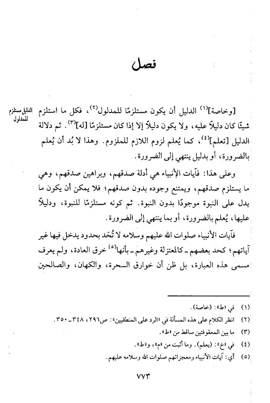 [وخاصة] 1 الدليل أن يكون مستلزماً للمدلول2. فكلّ ما استلزم شيئاً كان دليلاً عليه، ولا يكون دليلاً إلا إذا كان مستلزماً [له] 3. ثمّ دلالة الدليل [تعلم] 4، كما يُعلم لزوم اللازم للملزوم. وهذا لا بُدّ أن يُعلم بالضرورة، أو بدليل ينتهي إلى الضرورة.